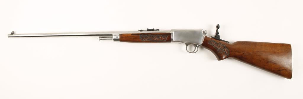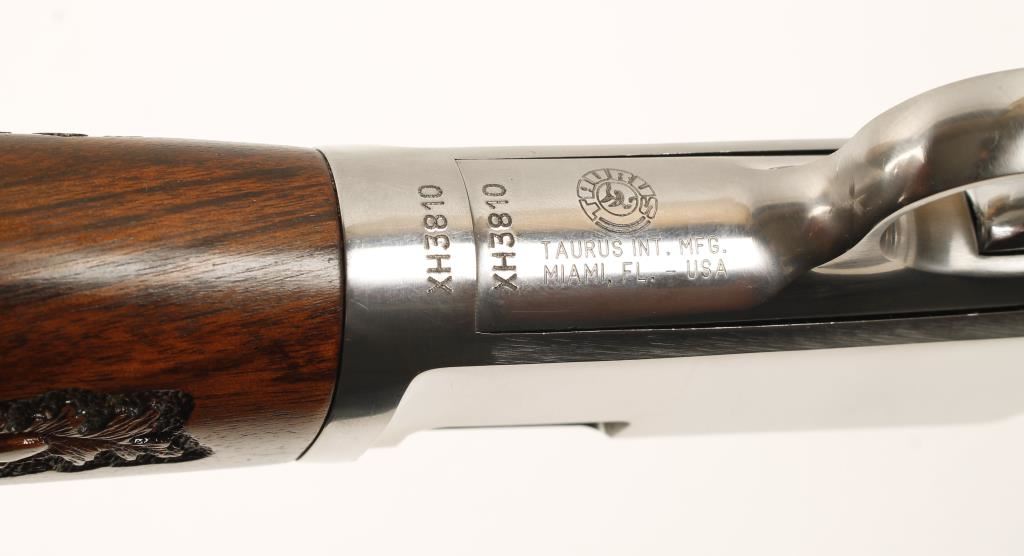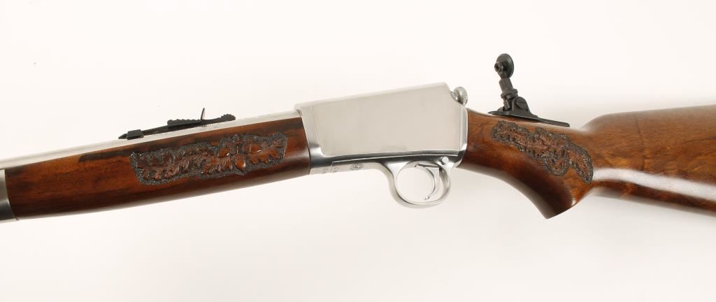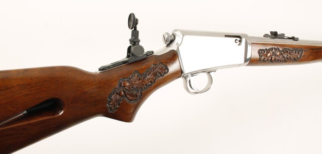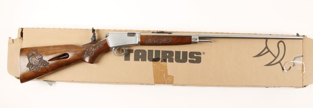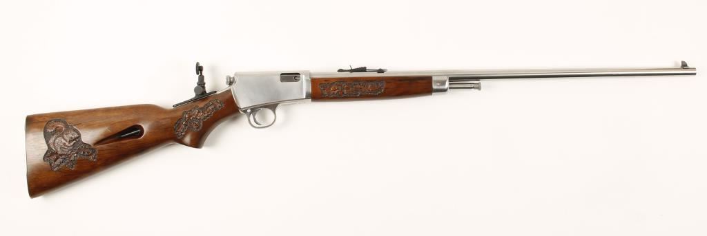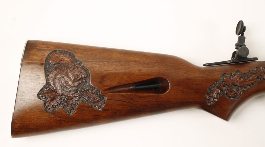 Brazilian made .22 caliber tube fed semi automatic takedown rifle modeled after the Winchester 63'. Features a 23" stainless barrel, rear peep tang sight, stainless take down receiver and custom carved walnut stock with squirrel, oak leaf, and acorn motif. Signed Jose Valencia 2007. Beautiful bore, appears to be unfired. Condition is like new in box. ***Modern Firearm***