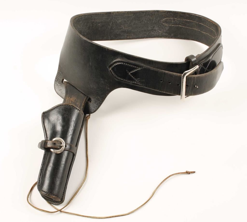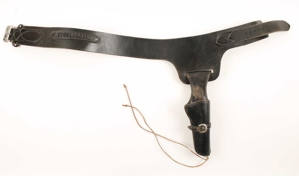 Well made black leather holster rig, unmarked but approximately size 36". Holds twelve .22 shells and fits a Ruger Single-Six perfectly.
