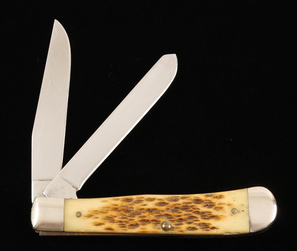 XX, 2 stainless steel blades, 6254SS with jigged bone or Delrin antler handle. Very good condition, minor chip to handle, shows age.