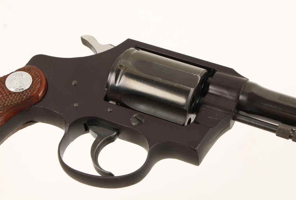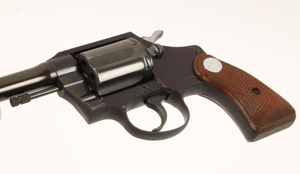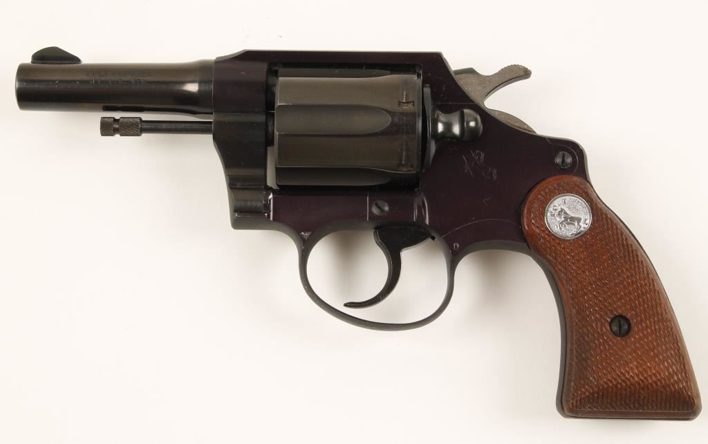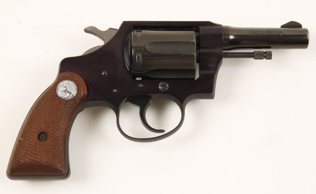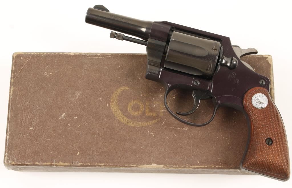 Double action lightweight revolver chambered in .22 Long Rifle and manufactured in 1954. Features a blued 3" tapered barrel, fixed front sight, blued long fluted cylinder, smooth cylinder latch, serrated trigger & parkerized hammer, checkered colt medallion wood grips, blued frame and parkerized backstrap & trigger guard. Finish has small areas of wear but remains 99% apparent. Bore is excellent as is action. Condition is like new in original factory box. ***Modern Firearm***