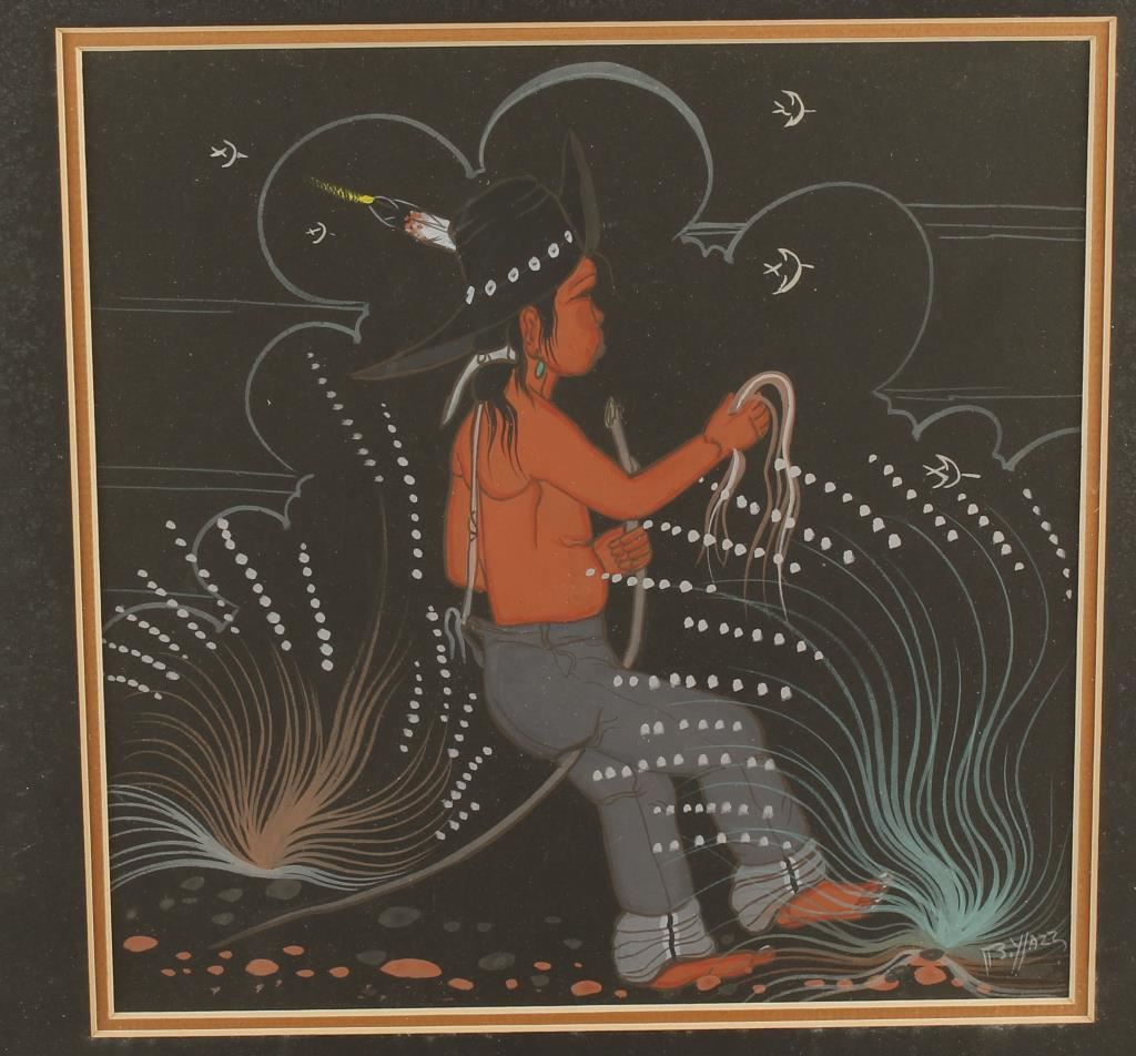 Depicts Ceremonial Dancer, double mat and frame. Image measures 9 1/4"x9 1/4". From AskArt.com- "Several books are based on his life and career, and he has been featured in numerous publications. He has won awards at every major showing of Indian art throughout the United States. The artist was drawing and writing with crayons at eight years of age. Sallie and Bill Lippencot, operators of Wide Ruins Trading Post, influenced him most by recognizing and encouraging his talents. While still a student, he sometimes worked in oils from a model. Today Beatien prefers to paint animals and people, not landscapes, in the casein medium. (Jeanne Snodgrass, "American Indian Painters). Beatien Yazz stated that he had been "painting since age eight," a long career in art that spanned over a fifty-year period. "I established myself nationally and internationally. In addition to my three oldest sons, Irving, Marvin, and Calvin (QQ.V.), I have three other children entering the field of art; my daughter, Francis Toddiy (Q.V.), who has been painting since she was ten, Jimmiy, Jr., and Orland Toddy. They are eleven through twenty-two years of age." (Artist,Personal Correspondance 1991). In recent years the artist's eyesight has deteriorated, and he has only peripheral vision. According to his long-time friend, Sallie Lippencott Wagner, he has glaucoma, and it has progressed too far to be treatable. He continues to paint, but only in a limited way."