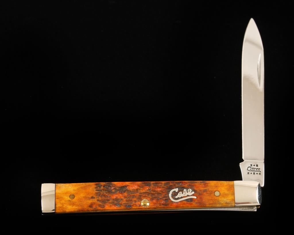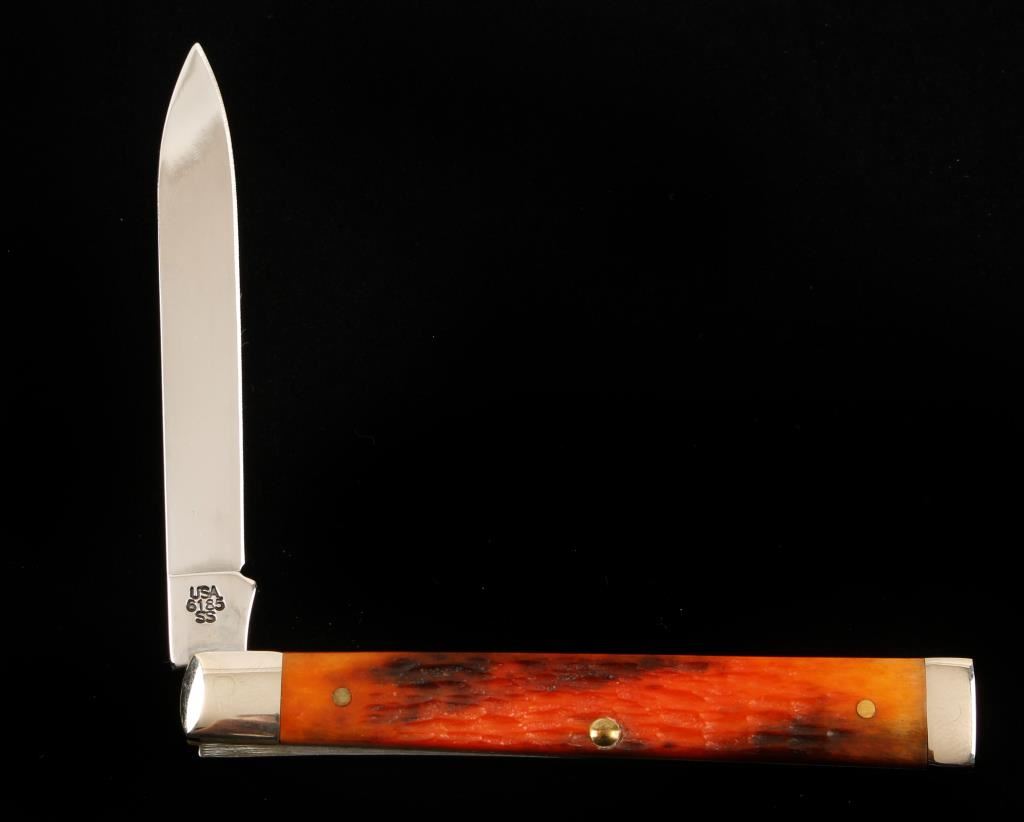 6185SS Single blade, orange and yellow jigged bone or Delrin handle. Made in 2002.