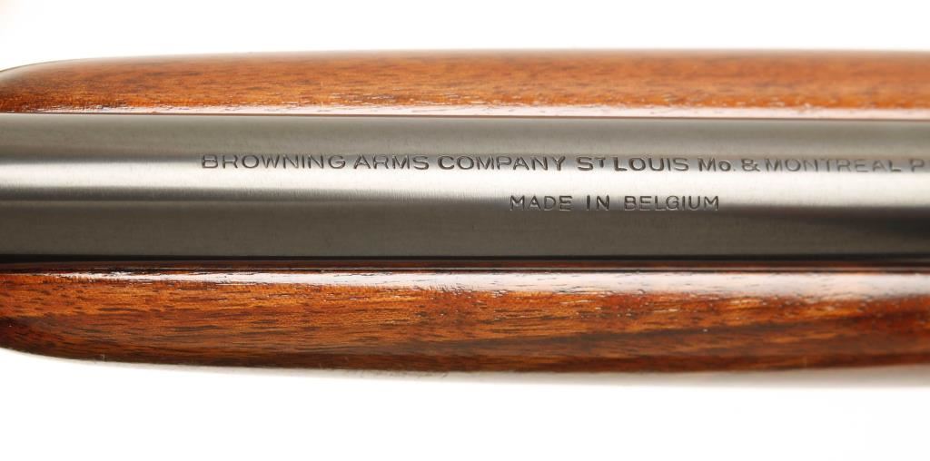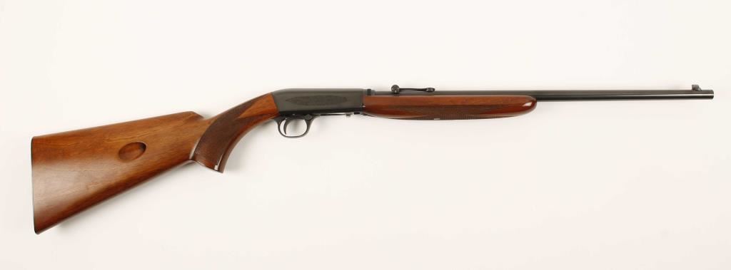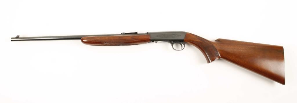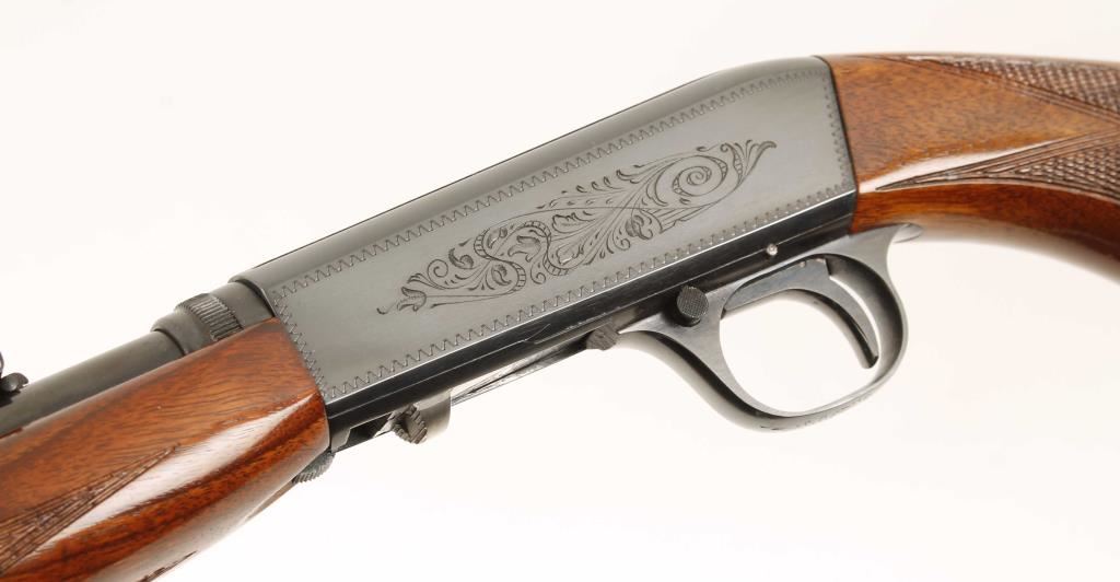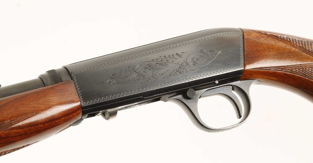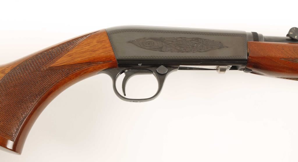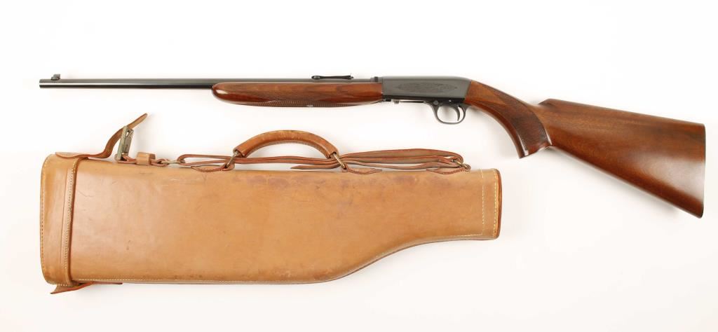 Early Belgium made Grade I tube fed blowback operated semi automatic rifle chambered in .22 Long Rifle. Features a blued 19.25" blued take-down barrel, fixed front sight, wheel rear sight, engraved blued receiver, 11 round tubular magazine and checkered walnut pistol grip stock and forend. Includes leather Winchester carrying case for when taken-down. Finish shows little to no wear, wood, bore, and action are all excellent. Overall condition is excellent. ***Modern Firearm***