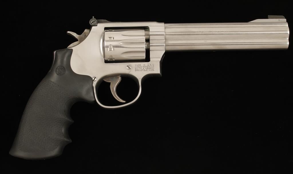Double action ten shot revolver chambered in .22 Long Rifle. Features a 6" stainless barrel with full ejector rod shroud, black Patridge front sight, micrometer adjustable rear sight, case hardened hammer & serrated trigger, stainless frame & fluted cylinder, smooth tang and Hogue rubber grips with the Smith & Wesson logo. Revolver has many small scratched and gives the it a slight 'brushed' appearance, bore is excellent and action works perfectly. Condition is very good in original factory box. ***Modern Firearm***