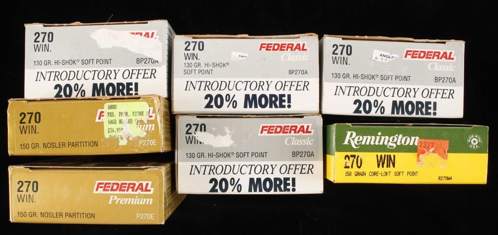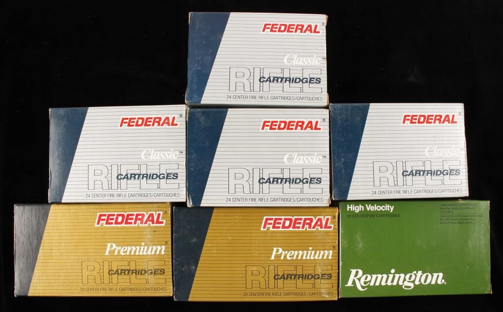 Includes: (4) 24 round boxes of Federal Classic 130 grain HI-Shok soft points, (2) boxes (missing seven rounds) of Federal Premium 150 grain Nosler Partitions and (1) box of Remington High Velocity 150 grain Core-Lokt Soft Points.