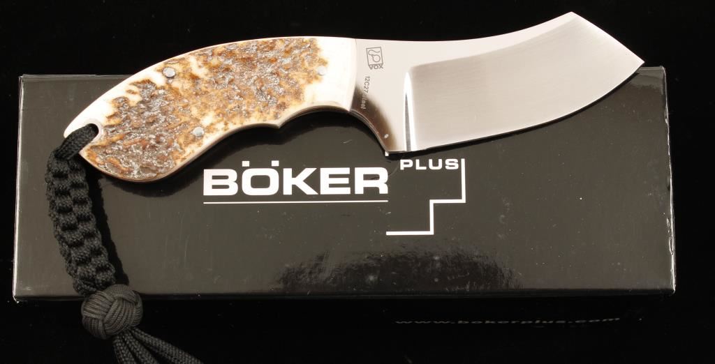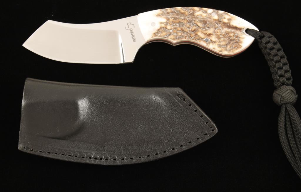 Single stainless steel blade, antler handle. Includes knife sheath, mint condition in original box.