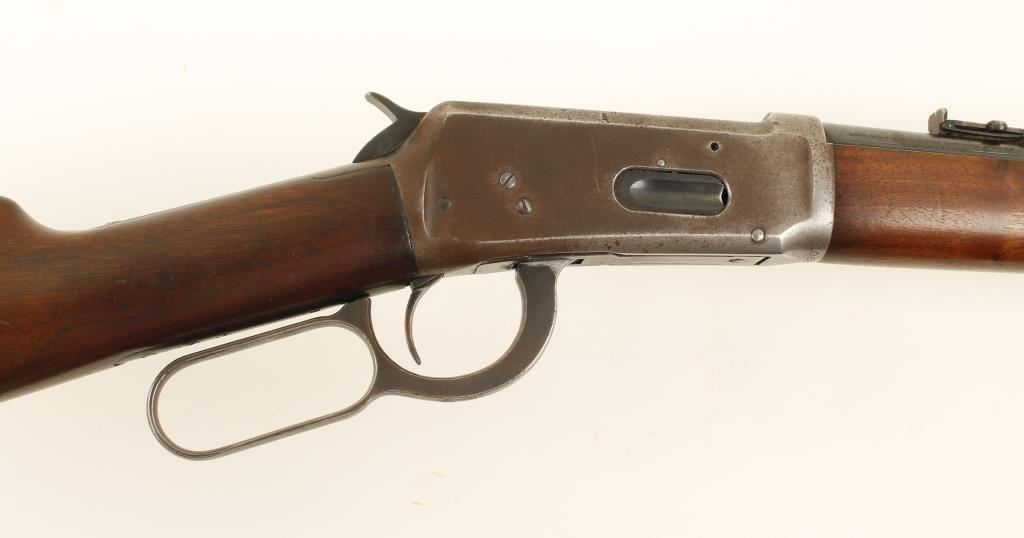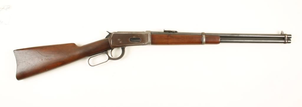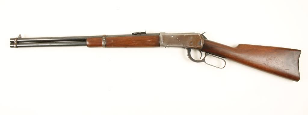 Vintage lever action Eastern carbine made in 1929 with 20" barrel. Blued finish, plain straight grip walnut stock and forend, full length tube magazine, carbine post front sight, flip up ladder rear sight and no saddle ring. Good clean bore and action is sticky. Condition: Very good showing brown patina on receiver, wood to metal fit is excellent. *Curio & Relic Firearm*