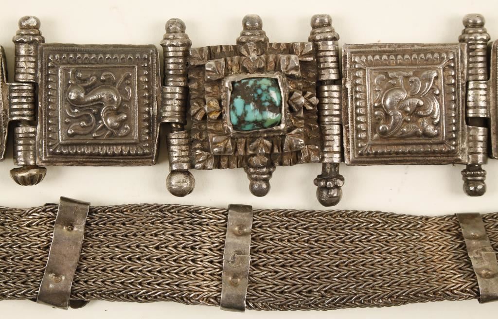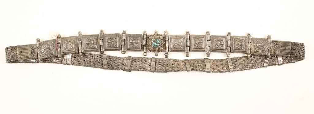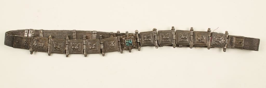 Constructed of silver with turquoise decoration. 19th century with original price tag for $3500. Measures 30" overall. Weighs .6 pounds.