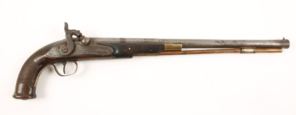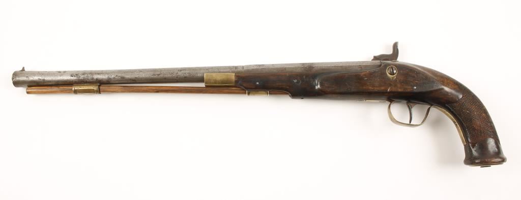 Interesting long barreled percussion cap and ball pistol by Boston gun makers Lane & Read circa 1920-1940's. Features a 15.5" half octagon/half round barrel, iron front sight, lightly engraved lock, checkered one piece wood stock, ram rod, brass trigger guards, forend tip, grip cap and ram rod guides. Barrel is in the white with pitting and rust. Lock and hammer have bark brown patina. Hammer will not stay in locked position. Condition is good as antique. ***Antique Firearm***