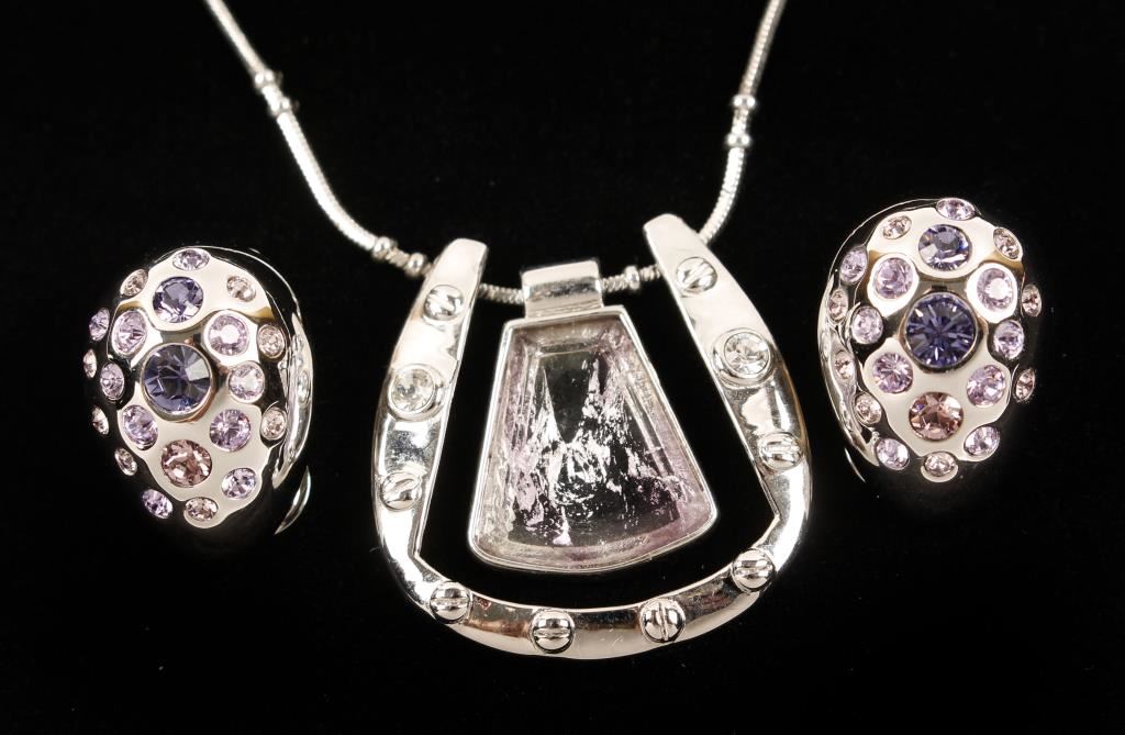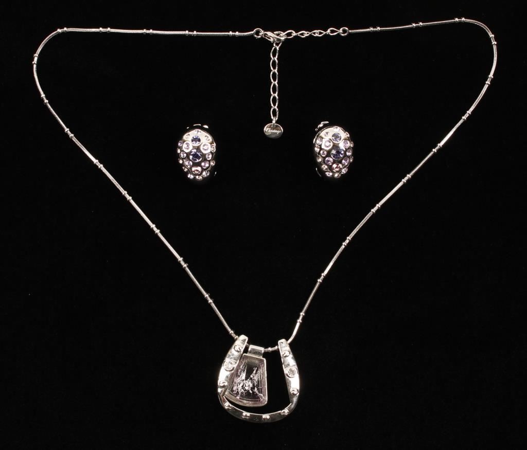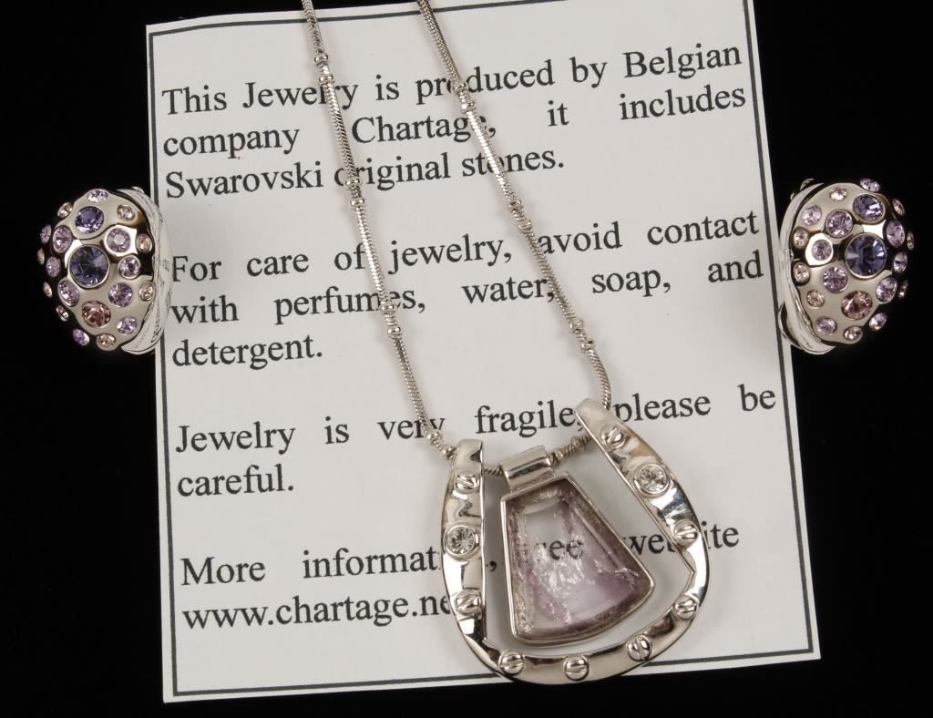 Silver chain holds a large horseshoe pendant that is accented with crystals, suspended inside the horseshoe is a clear piece with purple accents. Clip dome earrings are accented with purple and clear crystals. Necklace is marked 'Chartage' on horseshoe and chain. Chartage is a Belgian company and necklace and earrings include Swarovski original stones.