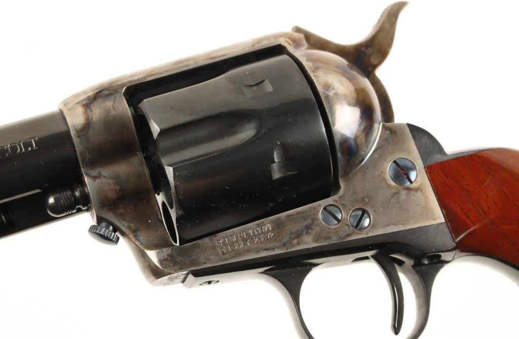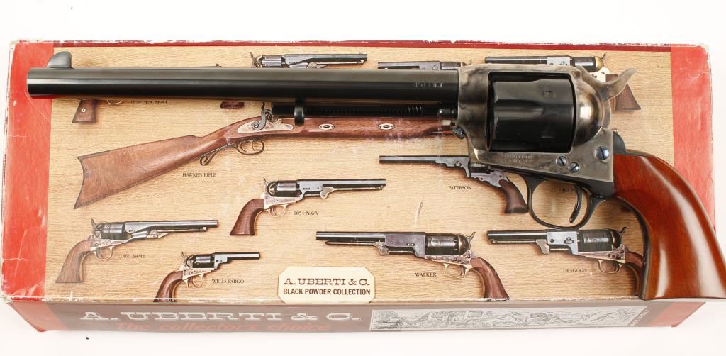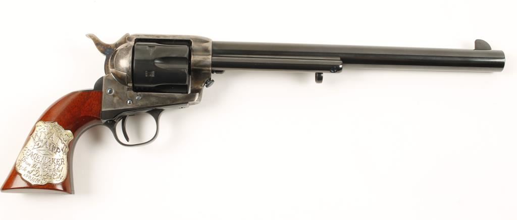 Italian made six shot single action revolver chambered in .45 Colt, modeled after Wyatt Earps famed Buntline Special ,marked Cimarron on barrel. Features a 10" blued barrel, front blade sight, blued cylinder, backstrap, trigger and trigger guard, case hardened frame and hammer, bullseye ring ejector and one piece walnut grips with hand inlaid solid silver plaque. Bore is excellent and likely unfired. Condition is like new in box. ***Modern Firearm***