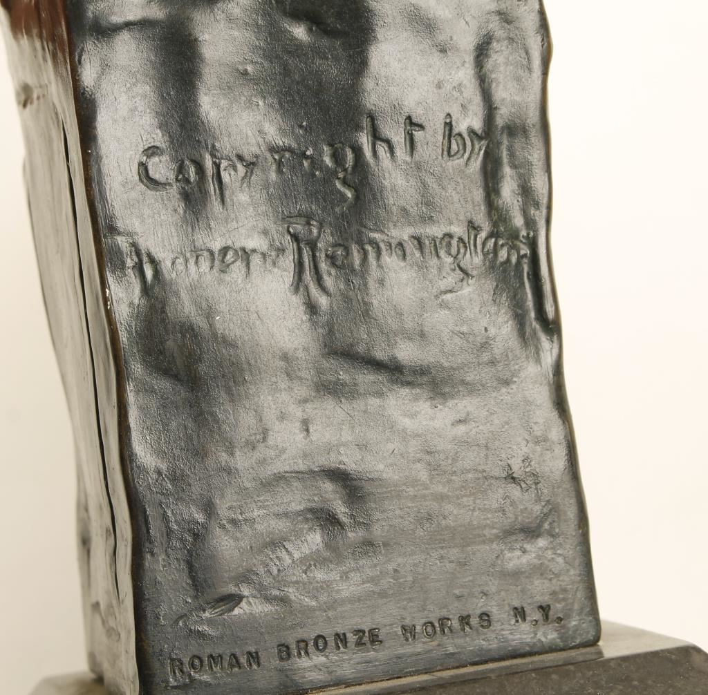 Marked "By the Roman Bronze Works New York, NY". and "Copyright by Frederic Remington" and sits on a marble base. 12"x4" green finish. Purchased 40+ years ago by a prominent Palm Springs collector.