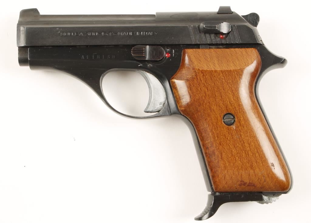 Compact Italian made single action semi automatic pistol chambered in .380 ACP. Features a 3.2" barrel, fixed sights, blued frame, slide and external hammer, two safety switches, seven round magazine, serrated trigger and smooth wood grips. Bore is very good. Condition is very good in box with cleaning brush.