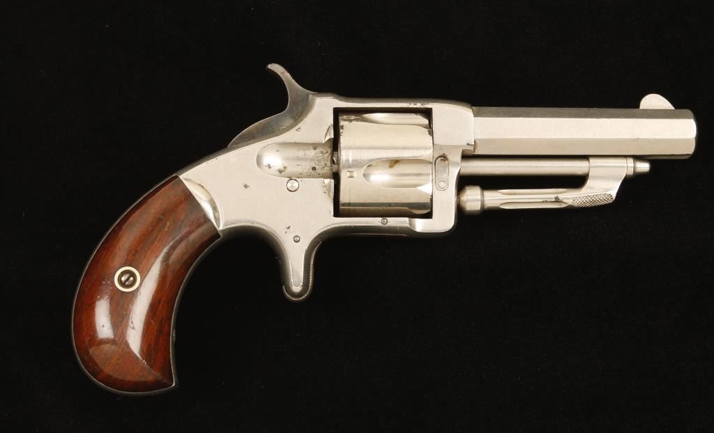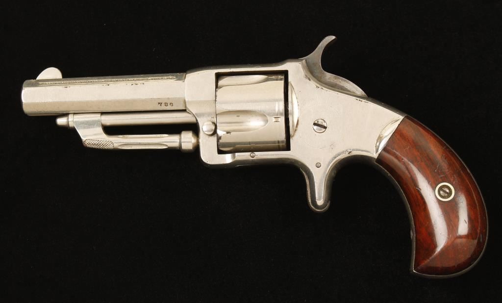 SN: 786. Nickel plated 5-shot single-action rimfire revolver with a spur trigger and a 2-11/16" octagon barrel. Plating is about 95% with only a few perforations on the edges and a few freckles on the flat surfaces. There is a drag line. The bore is bright and shiny with strong 3-groove rifling. The chambers are shiny. Action is very good with tight lock-up. Grips have finish wear on the high points and a few rubs and dings. Condition is very good. *Antique Firearm*