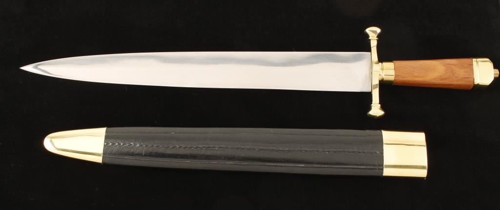 Brass guard, blade measures 14" with brass and leather sheath