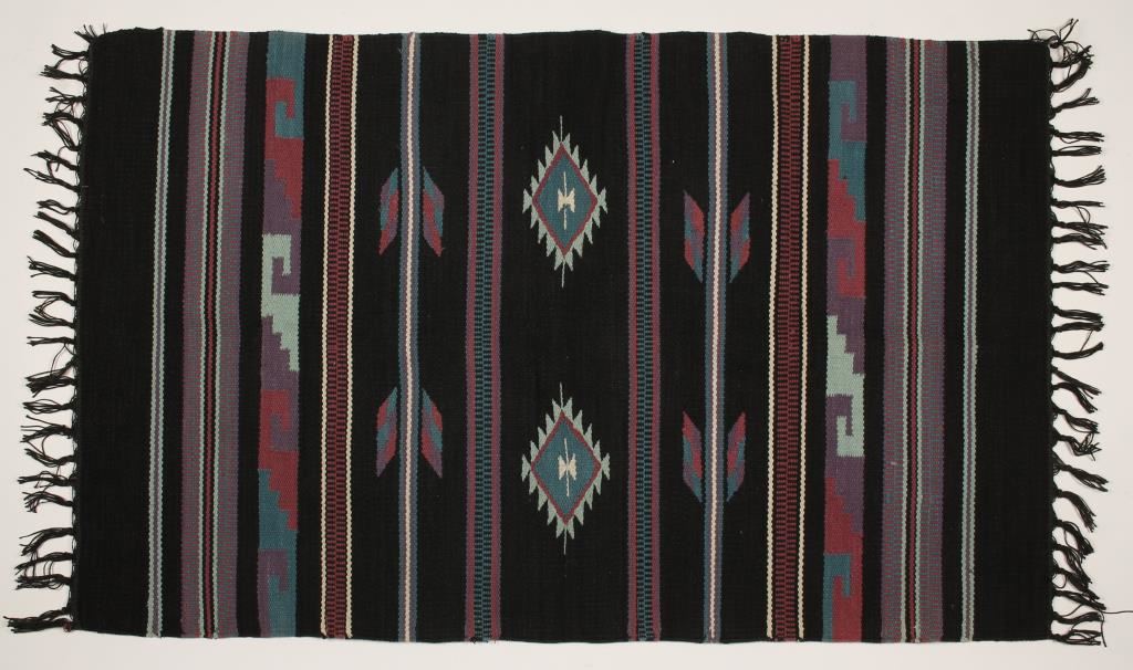 Large hand woven textile with black and pastel color material, measures 46" x 39". Condition is good.