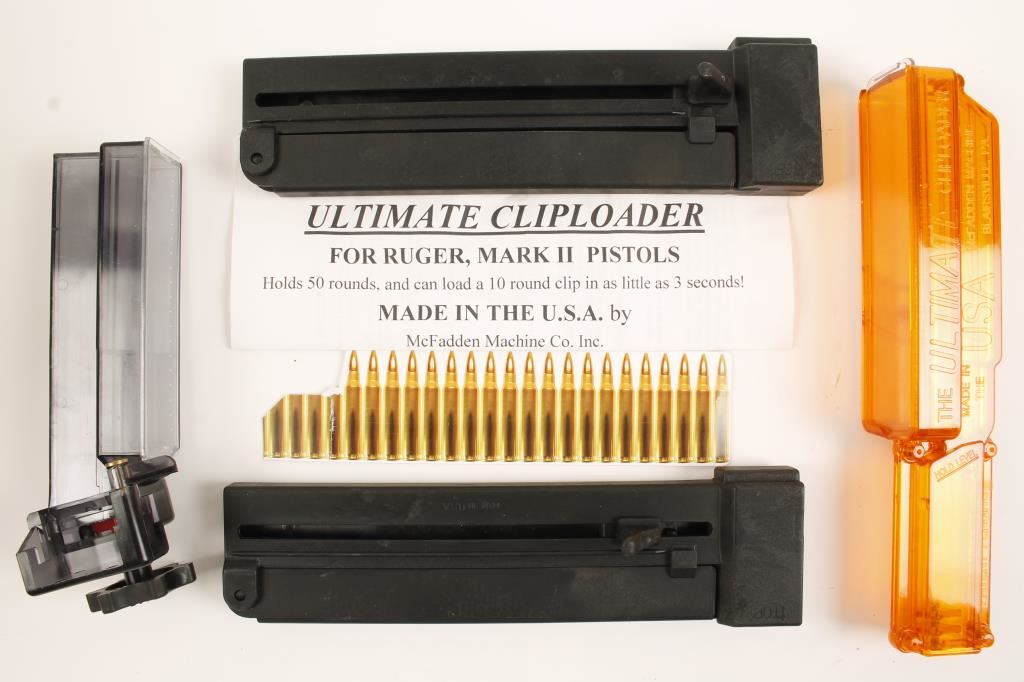 Includes: two Cammenga Easyloaders for .223, an Ultimate Cliploader for Ruger Mark II pistols, and a Butler Creek Hot Lips Loader.