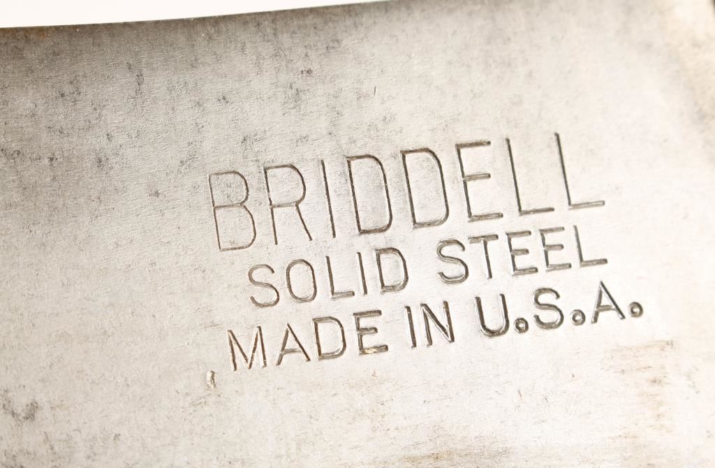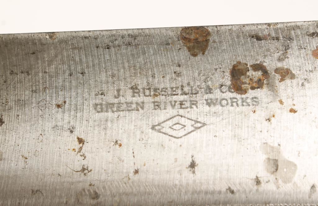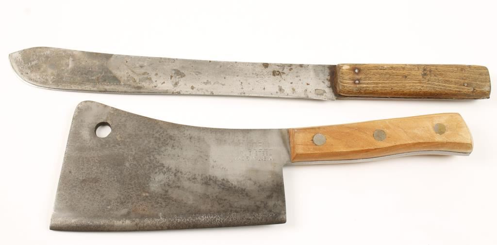 1 is a 12" butcher knife marked 'J.Russell & Co., Green River Works', and 1 is a Bridell meat cleaver.