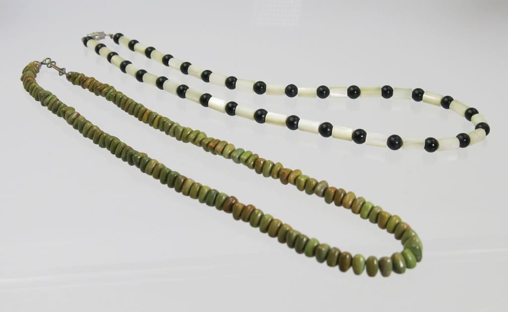(1) Mother of Pearl and Onyx beaded necklace and (1) Olive Turquoise necklace.