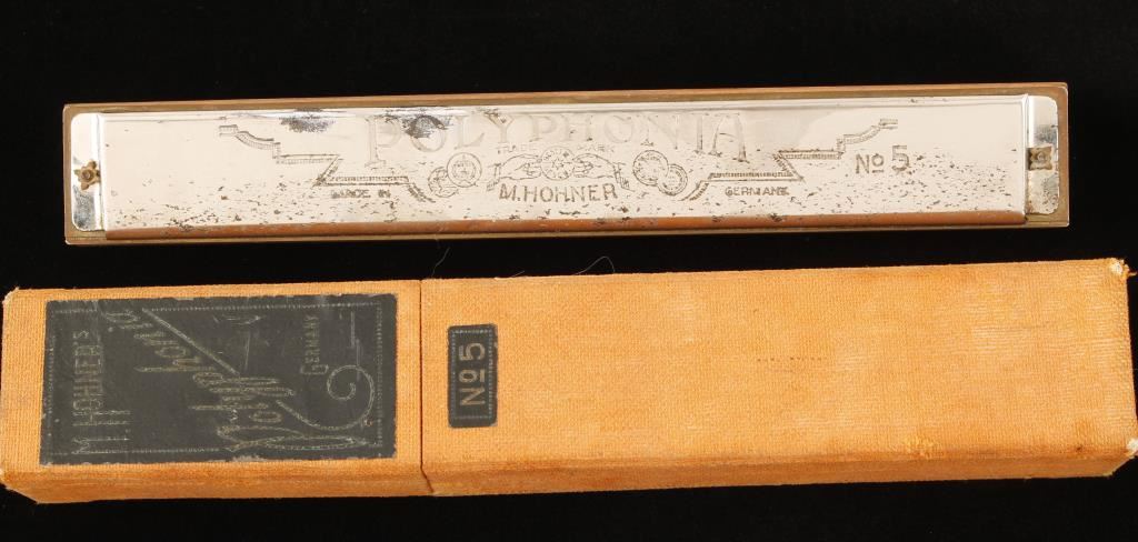 M. Hohner Polyphononia #5 in original box. Featured wood body with burl veneer, brass reads and polished metal exterior. Condition is good.