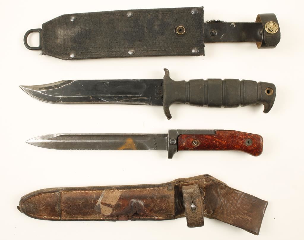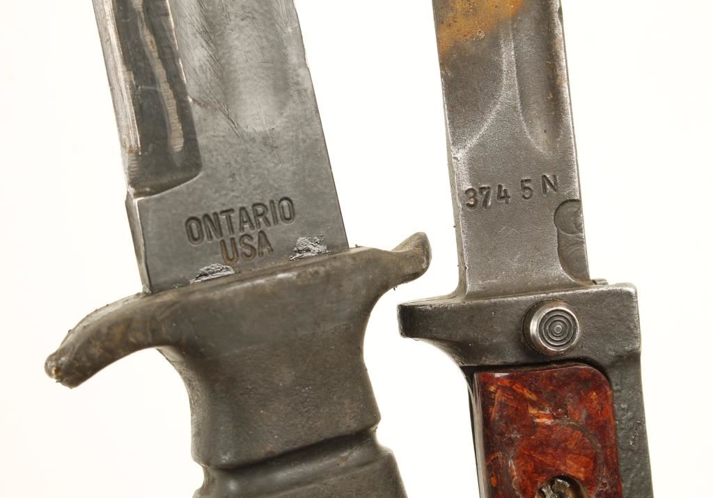 Includes an Ontario Spec Plus Marine knife with nylon scabbard and a bayonet with leather scabbard.