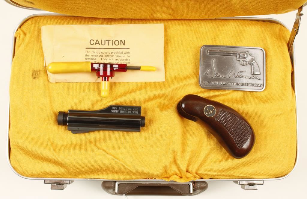 Plush case includes a .38/.357 Mag 4" barrel, barrel tool with gauge, belt buckle and medallion wood grips.