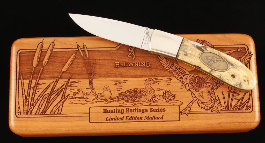 1/3000 Mallard Edition. Includes laser engraved wood commemorative box, model 24 pocket knife with burled wood handle, and a Browning print. In original box, mint condition.