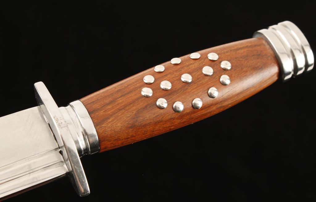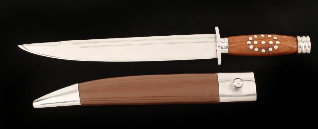 9 1/2" blade, wood handle with nickel plated tack design. Includes leather and stainless steel sheath.