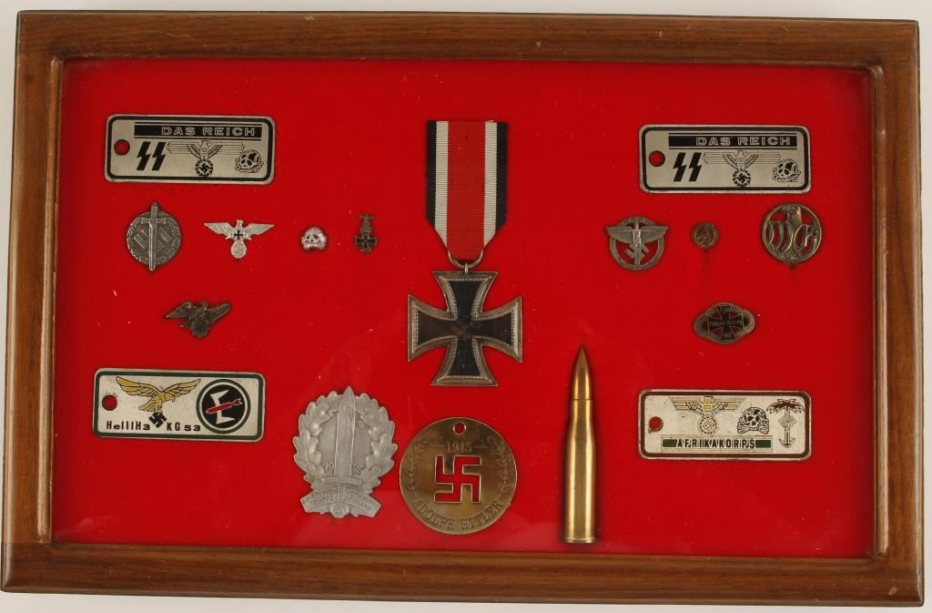 Including: 4 metal tags-2 that read "Das Reich", 1 that reads "HeIIIH3 KG53" and 1 that reads "Afrikakorps", Iron Cross Medal with ribbon, shell casing, 9 small pins and much more... In wooden display box with red velvet lining that measures 14"x9"x-1-1/2".