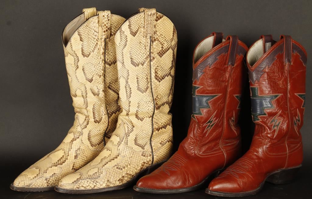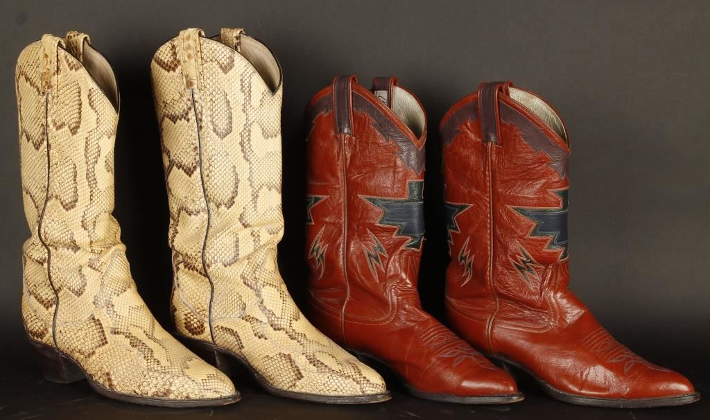 Includes one pair of Python skin boots and one pair of leather boots with southwest designs and stitching.