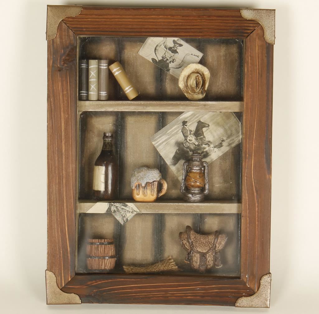 In great condition. Displays a choice selection of miniature cowboy memorabilia. Antiqued metal frame, glass front and back metal display box. Measures 12" high, 9" wide and 2" deep.