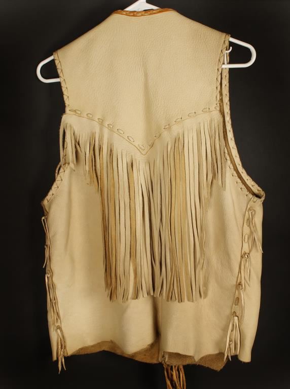 Fringed light tan vest with antler and bead accents.