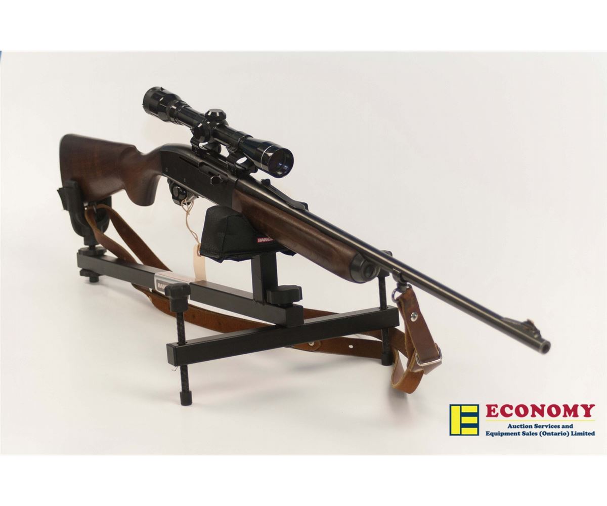 Remington 740 Woodsmaster Rifle (Non-Restricted) Semi-Auto, it has a 28" barrel, 308 win. The wood is cracked behind the receiver, the bore is in very good condition, bluing is slightly worn from carrying, comes with a Tasco 4x32 scope and attached leather sling. SN: 138629