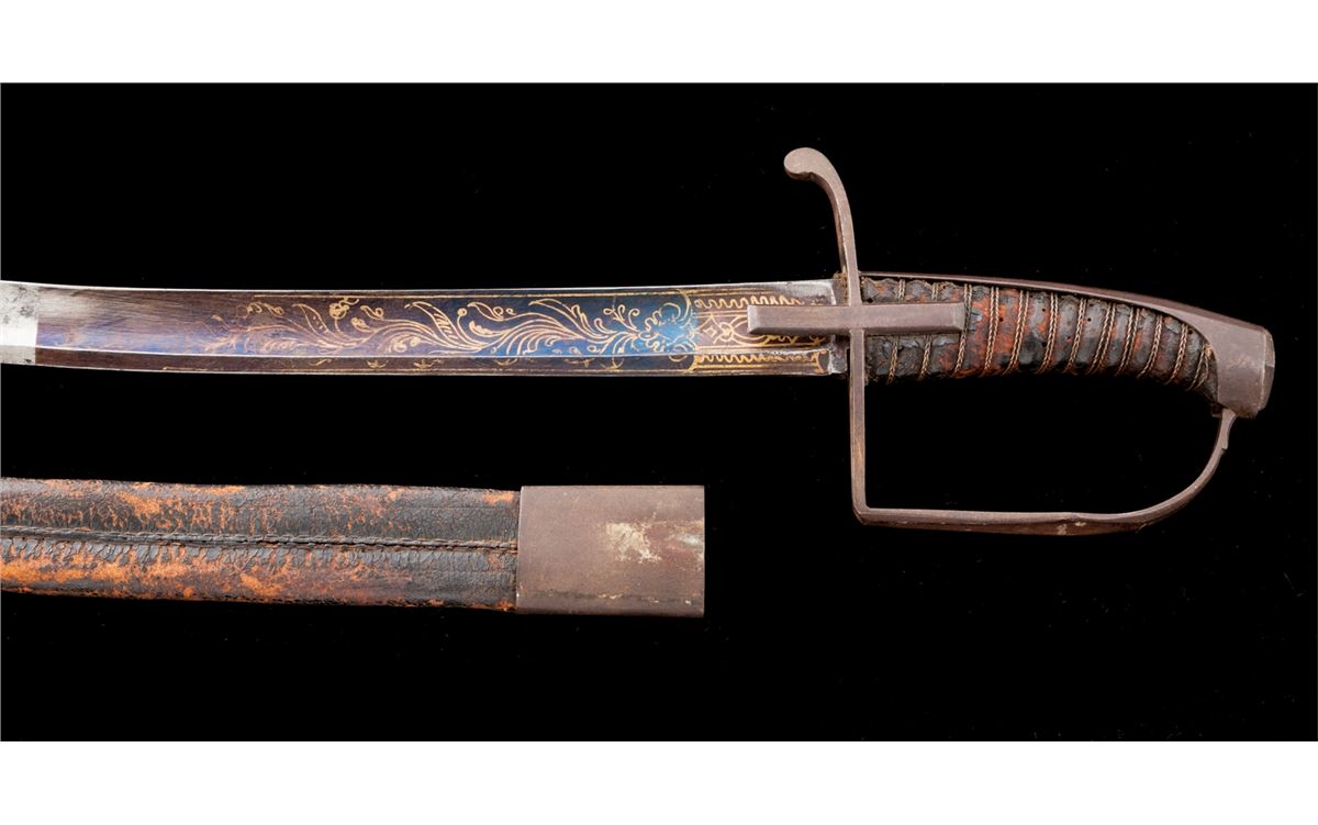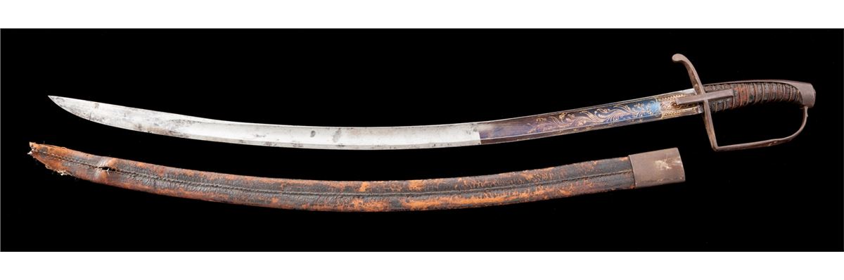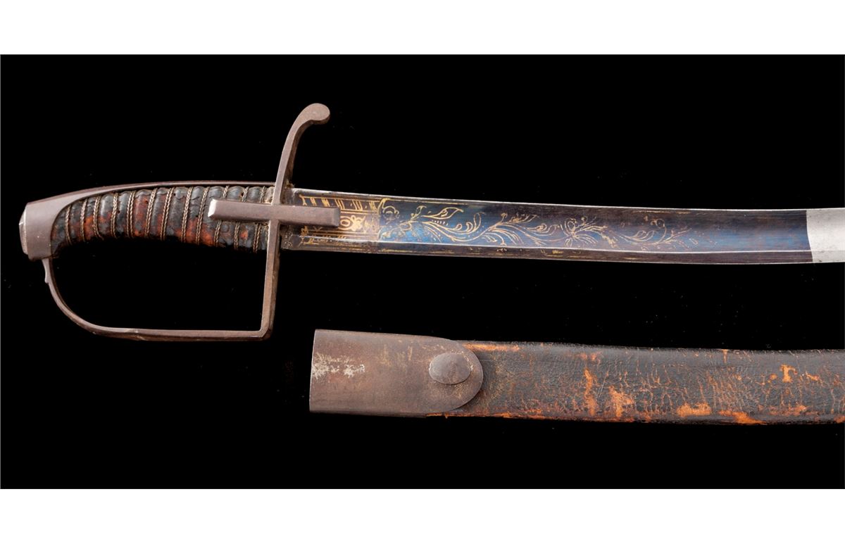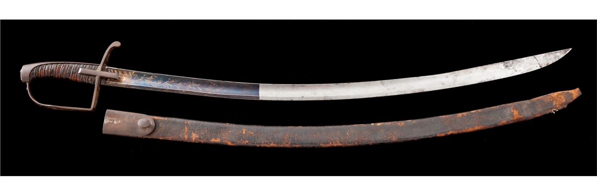 Revolutionary War Era Horseman's Saber with stirrup grip (1775-1783), 30'' curved blade, 35'' overall, with iron guard, wire wrapped leather handle over wood, lower third of blade blued with gold details. Leather scabbard with throat is retained (missing tip). Blade thickness is slightly over a quarter inch at crossguard, with nice even wide fuller tapering to flat approx. 6'' from tip. Condition is very good with moderate carbon spotting to blade, yet with over 80% original blue and gold remaining. Grip leather has thinned and flaked with only about 30% remaining. Iron grip components have toned brown. Seldom-seen scabbard is black tanned leather with iron throat and integral stud for attachment to frog. Tip is missing. Leather has flaked and thinned to approx. 60% with some loose stitching at tip area. Est.: $750-$1,000.