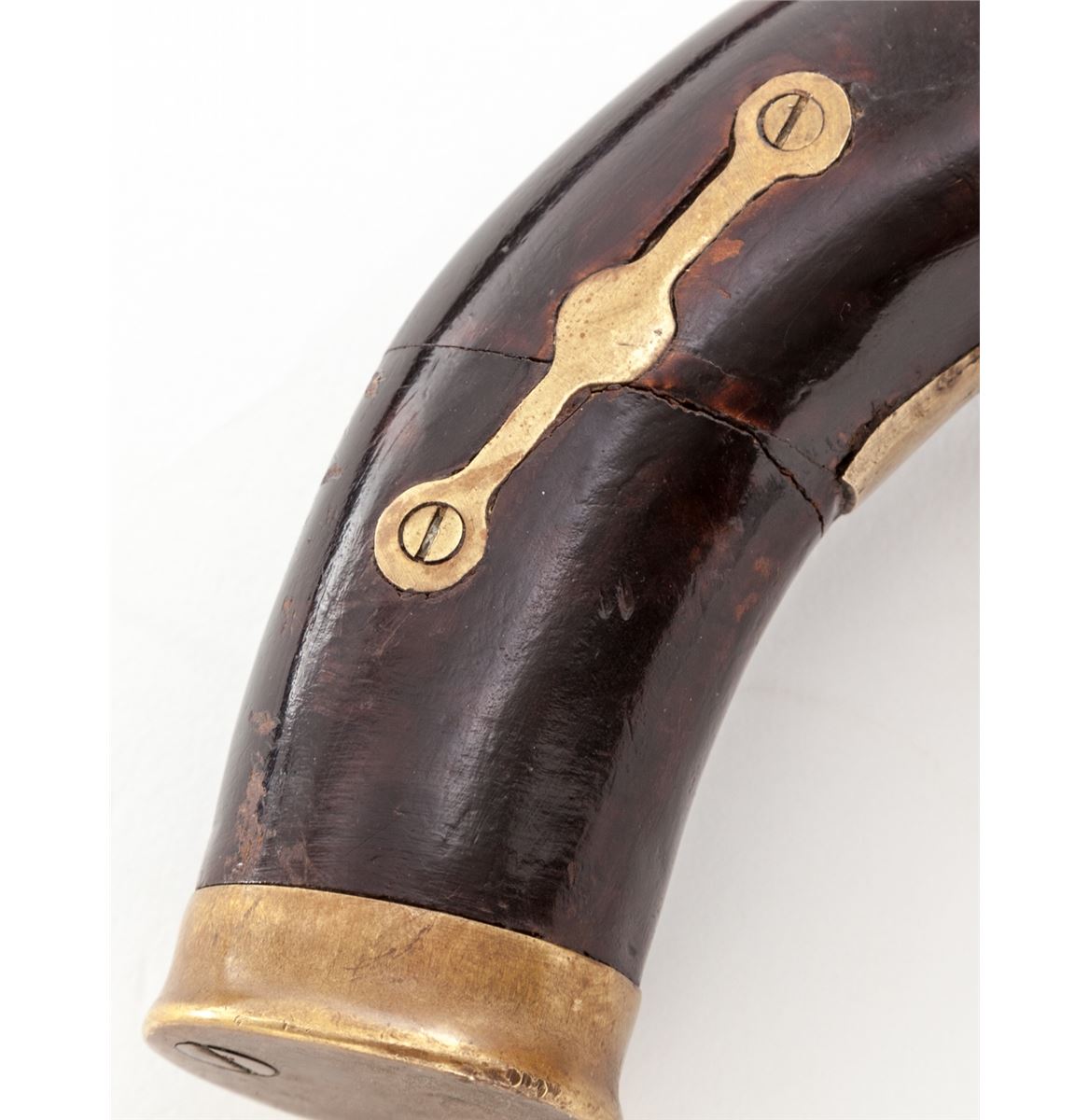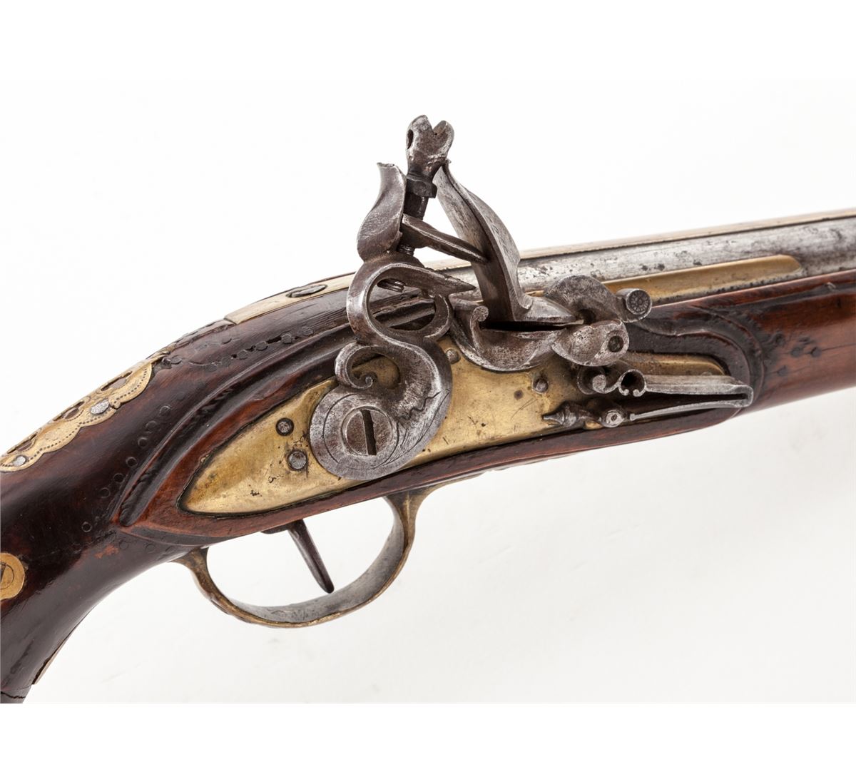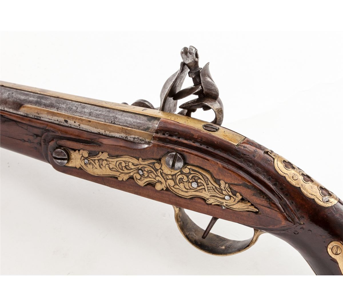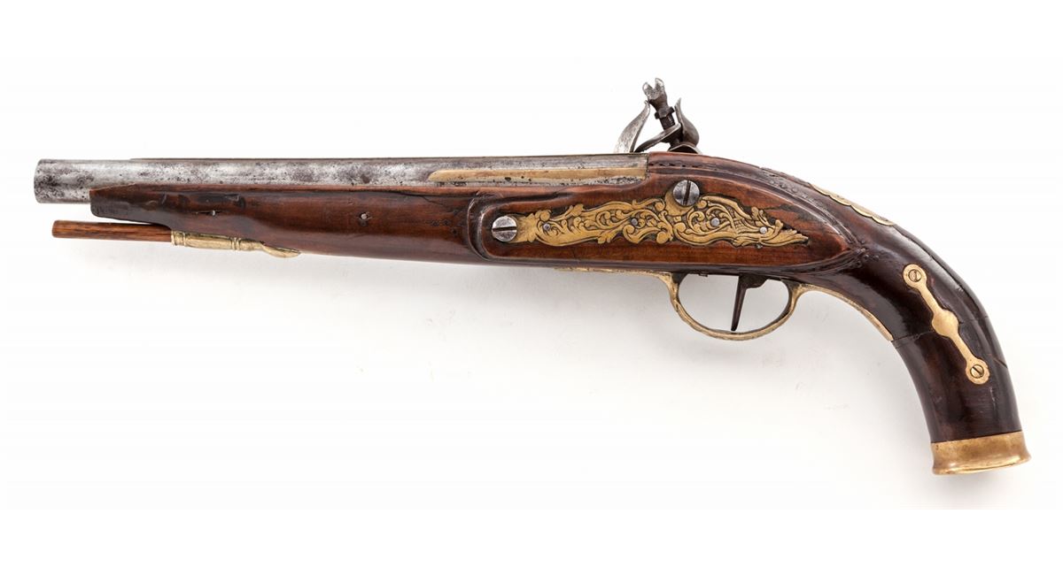 Italian Flintlock Pistol, .60 cal., 9-1/2'' barrel with decorative bronze bands, brass lockplate, triggerguard, sideplate and ramrod ferrules; beautifully executed baroque cock, frizzen pan and spring, and of possible Venetian mfg.; full-length Mediterranean stock. Condition is very good to fine with moderate carbon spotting to bright portions of barrel. Stock shows very subtle nailwork around lock and sideplate. Professionally executed repair to butt using decorative brass straps. Good functioning action, with later replacement rammer. Est.: $750-$1,000. (Antique)