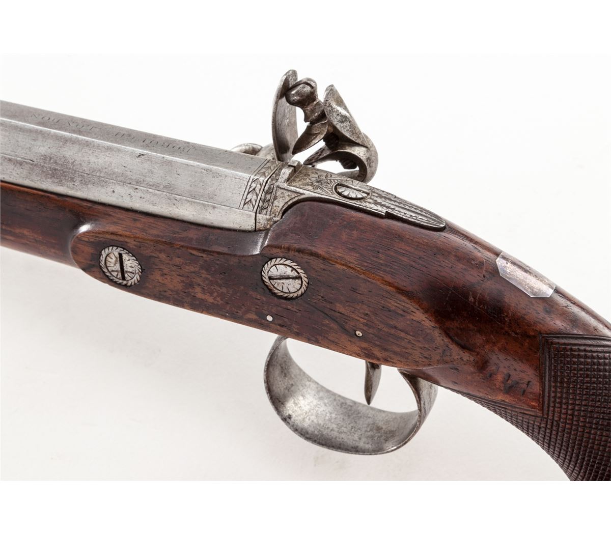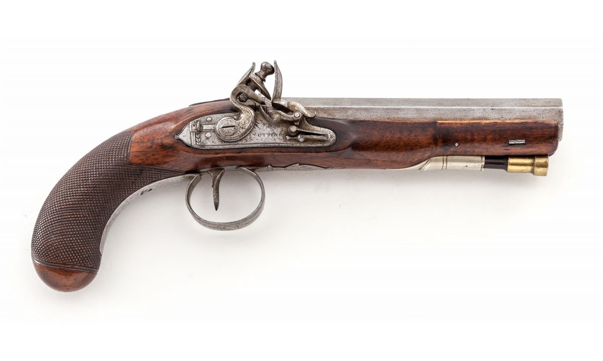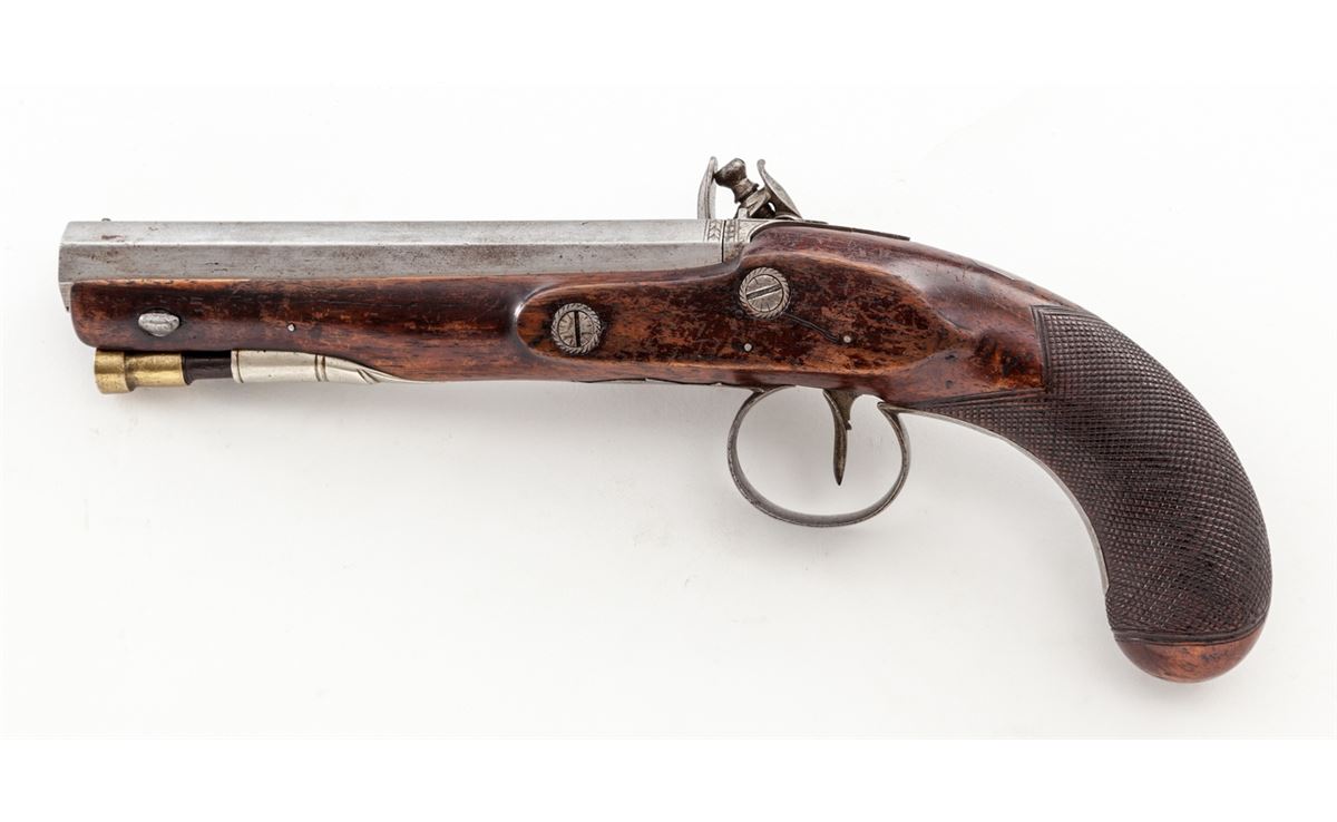 English Large Bore Utting Flintlock Coat Pistol, .62 cal., 6.25'' octagonal barrel, checkered walnut fullstock with bag grip. Brass-tipped ramrod is present. Top barrel flat marked ''Burough, London''. Condition is excellent with good detail to light engraving. Stock shows only minor flattening to checks, with losses to varnish on left side. Action needs some adjustment, as it does not consistently remain on full cock; smoothbore is fine. Est.: $600-$800. (Antique)