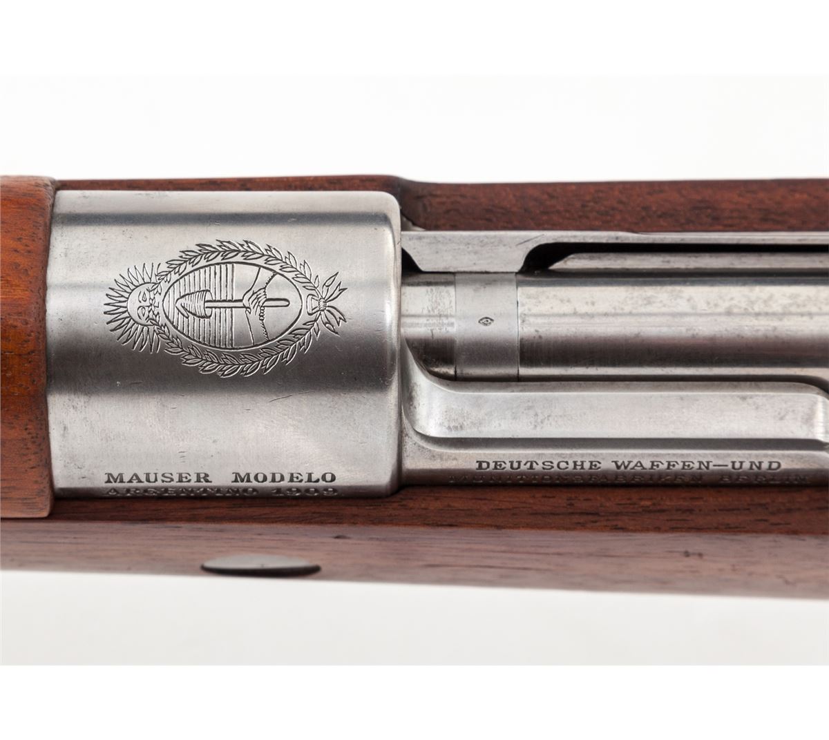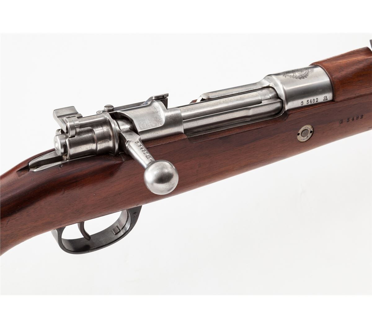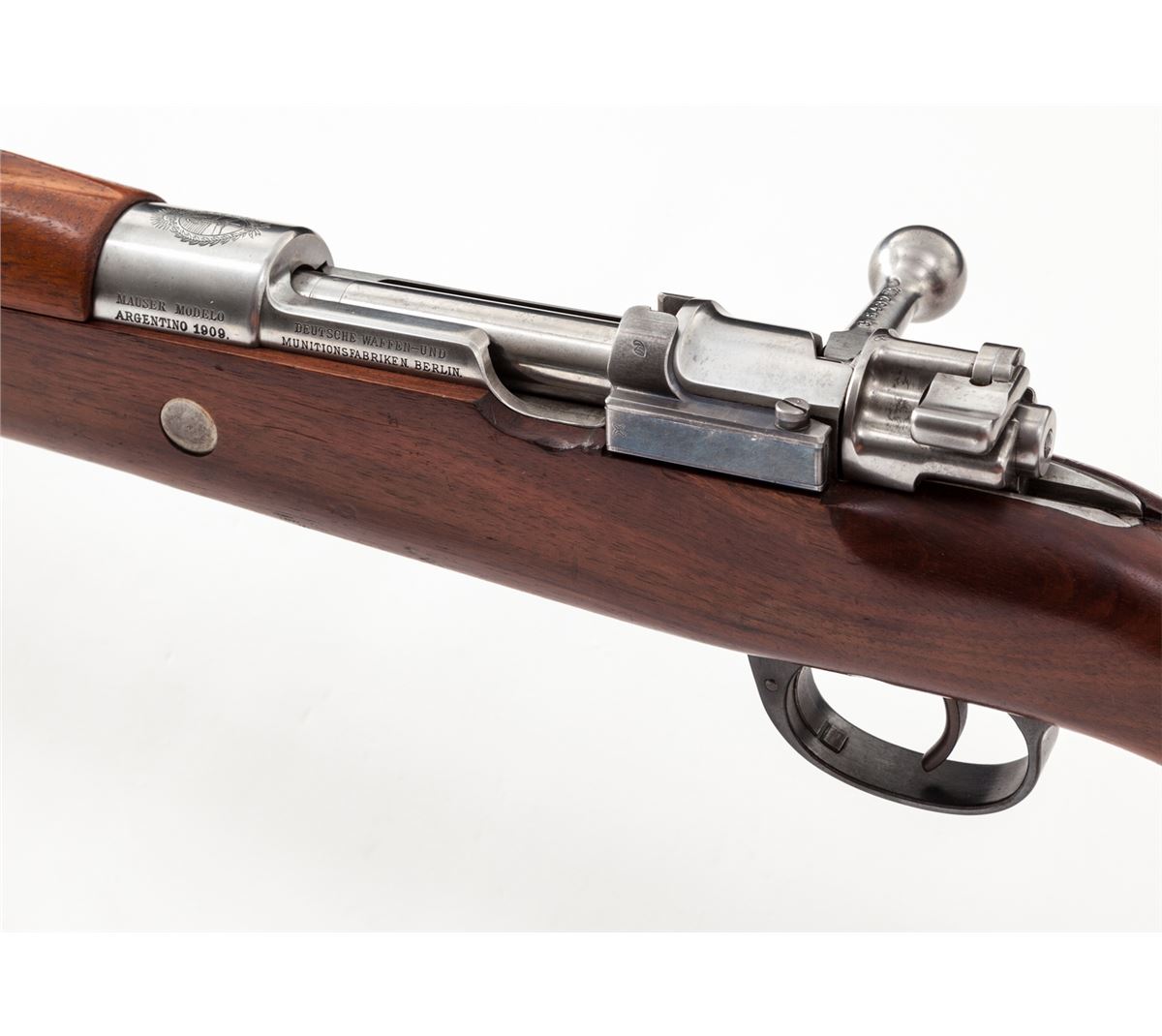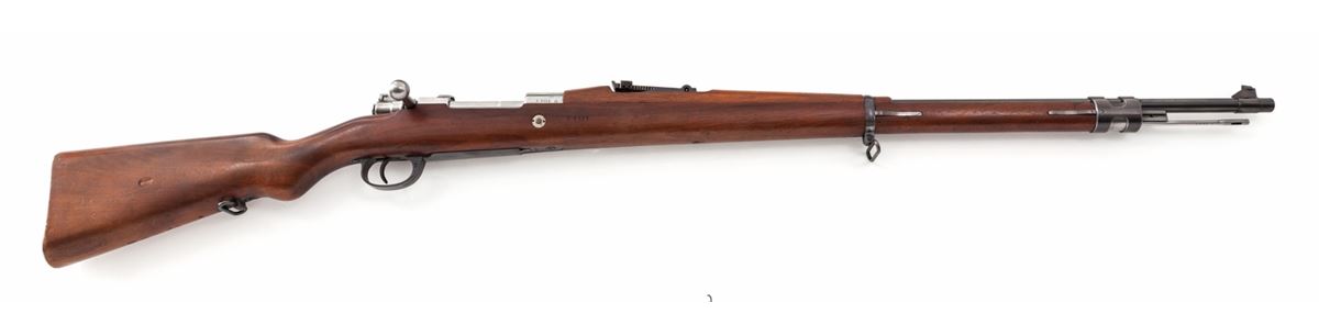 Argentine Model 1909 Bolt Action Rifle, by DWM, #G5482, 7.63 Arg. cal., 29-1/2'' blue barrel, bright frame and bolt, matching numbered European walnut stock with cartouches. Condition is excellent with all matching numbers and no importation markings. Fire blue bolt latch retains about 75% blue; exposed portion of barrel 95%, with thinning to barrel bands. Stock with light handling marks. Crisp action, fine bore. Est.: $500-$750. (C&R)