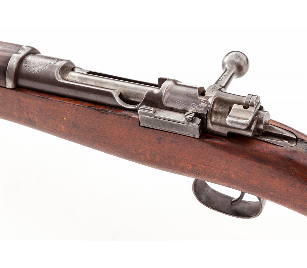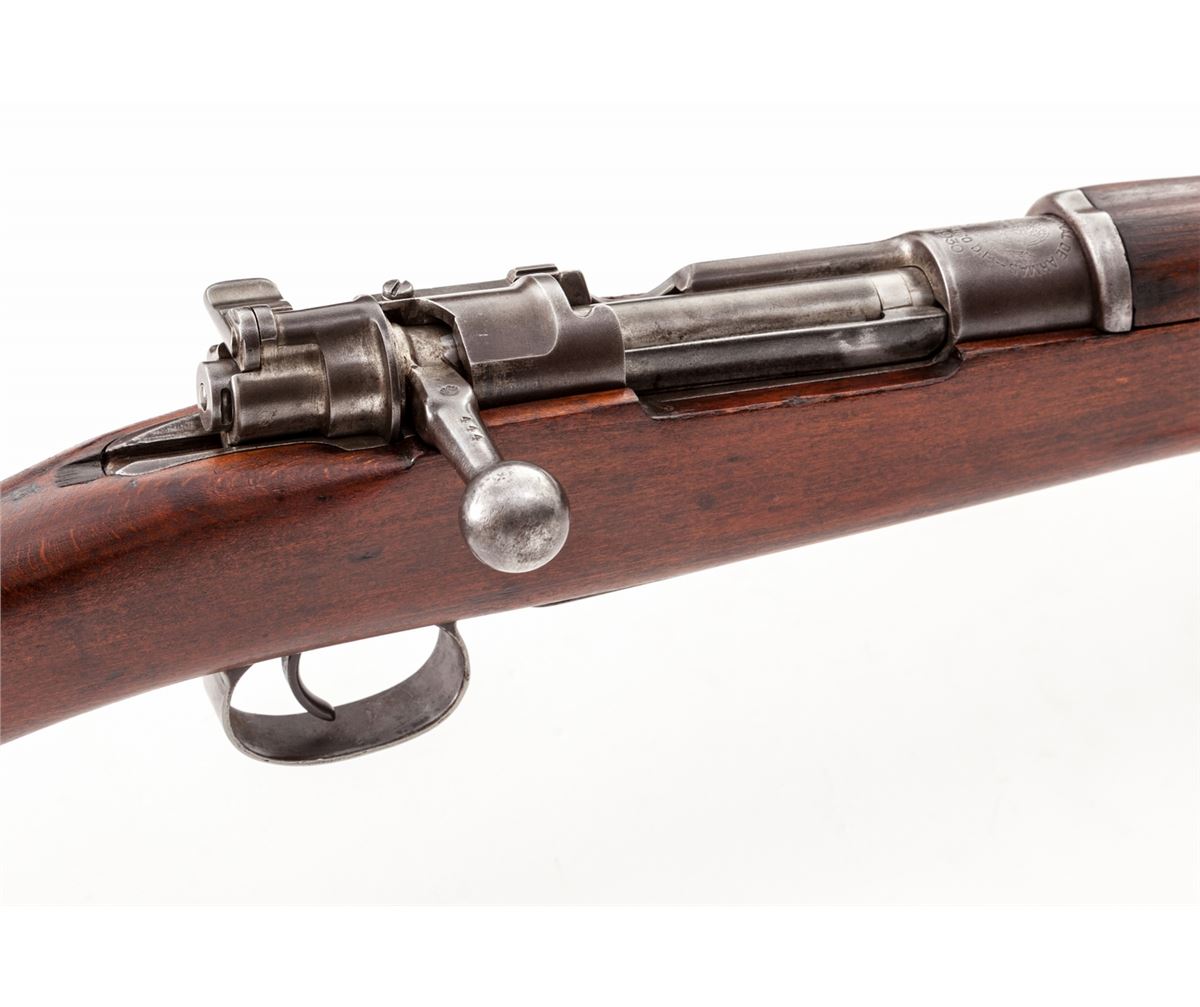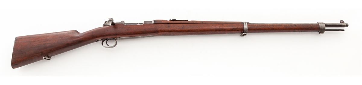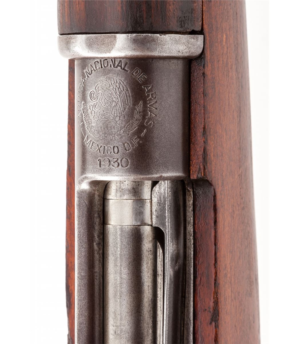 Mexican Model 1910 Bolt Action Rifle, by Fabrica Nationale de Armas, Mexico, D.F. (1930), #444, 7x57mm, 29-1/4'' barrel, blue finish, bright bolt, dark stained beechwood stock. Condition is about fine as lightly import marked to end of barrel, retaining approx. 80% thinning blue. Stock is excellent with just small dings. All visible matching numbers. Good action, very good bore. Est.: $400-$600. (C&R)