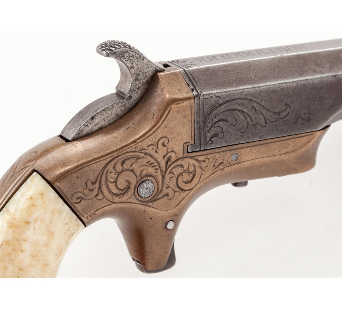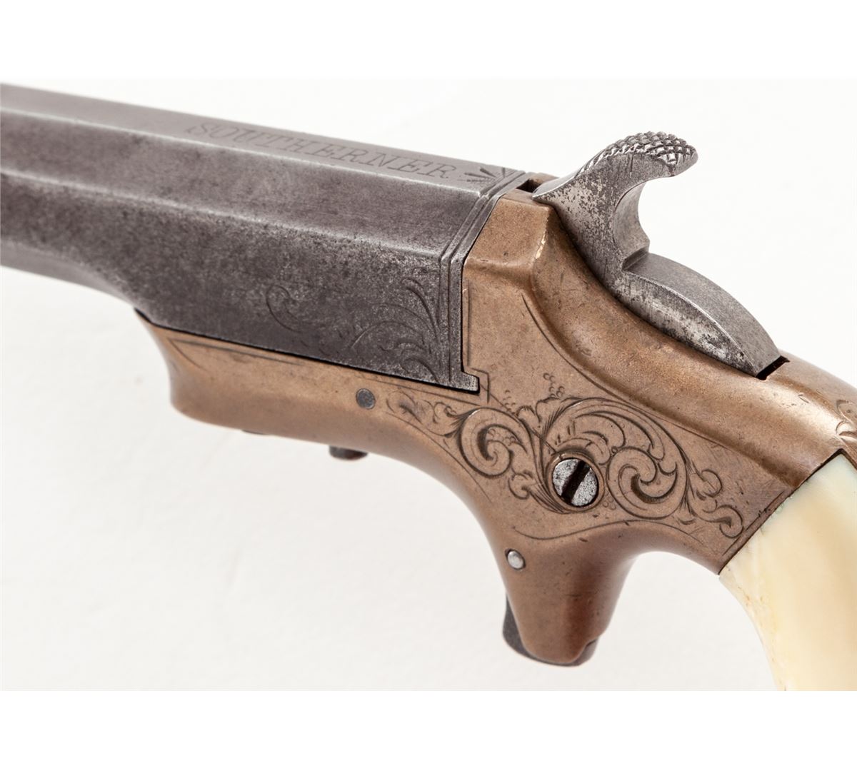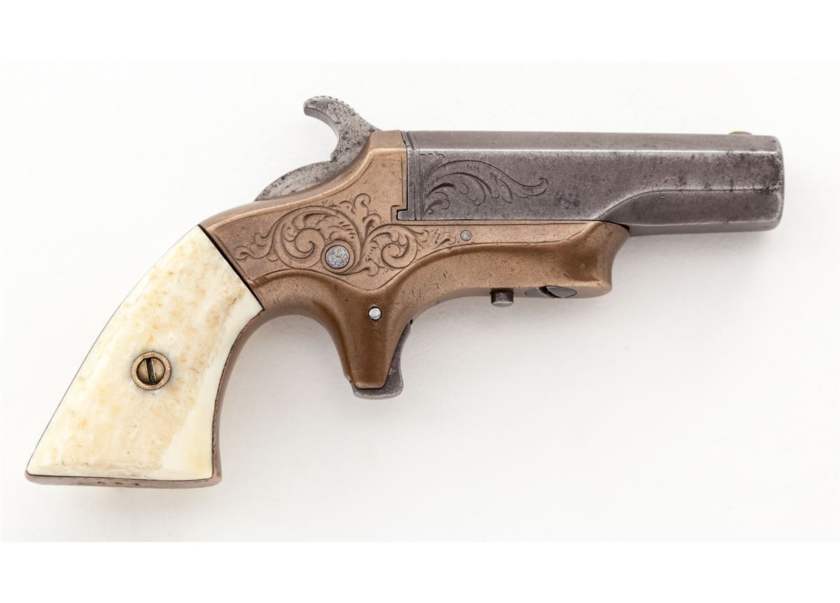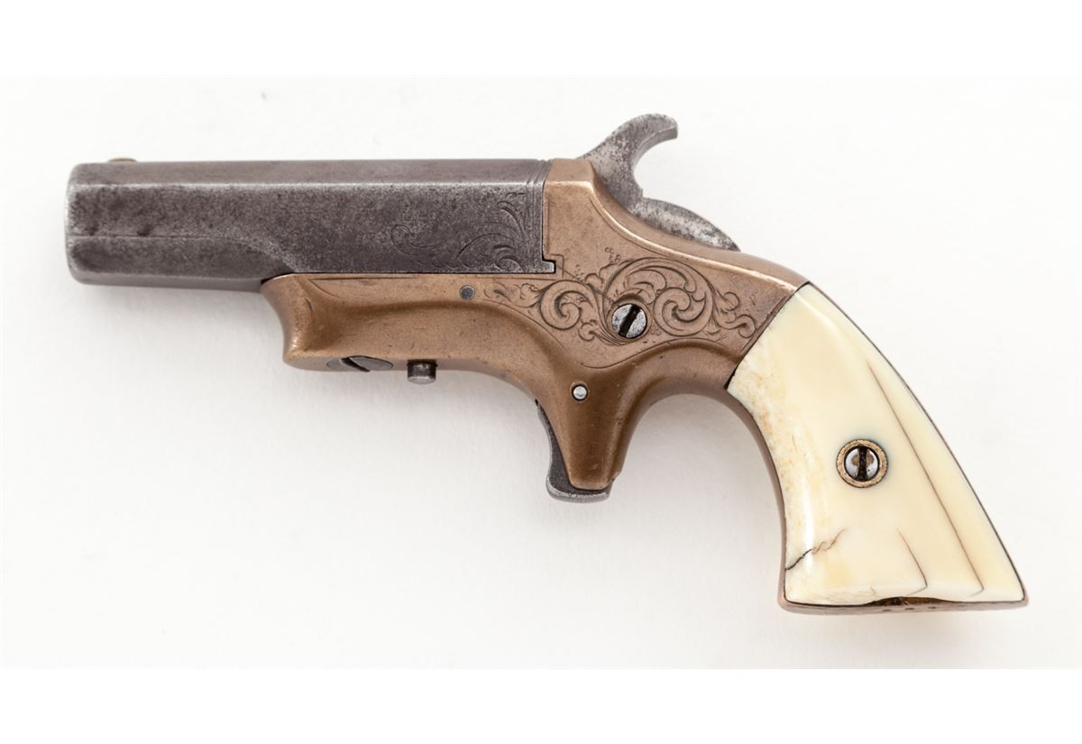 Southerner Single Shot Pistol, by Merrimac Arms, #427, .41 RF cal., 3-1/2'' flat-sided iron barrel, lightly scroll engraved brass frame, with bone grips. Condition is very good. Barrel assembly's blue has thinned and toned to approx. 30% of original. Frame with little of its original silver plate remaining. Grips with small inclusions and loss at butt near locating pin. Internal action needs light cleaning, as hammer does not always stay back. Bore is fair. Est.: $500-$750. (Antique)