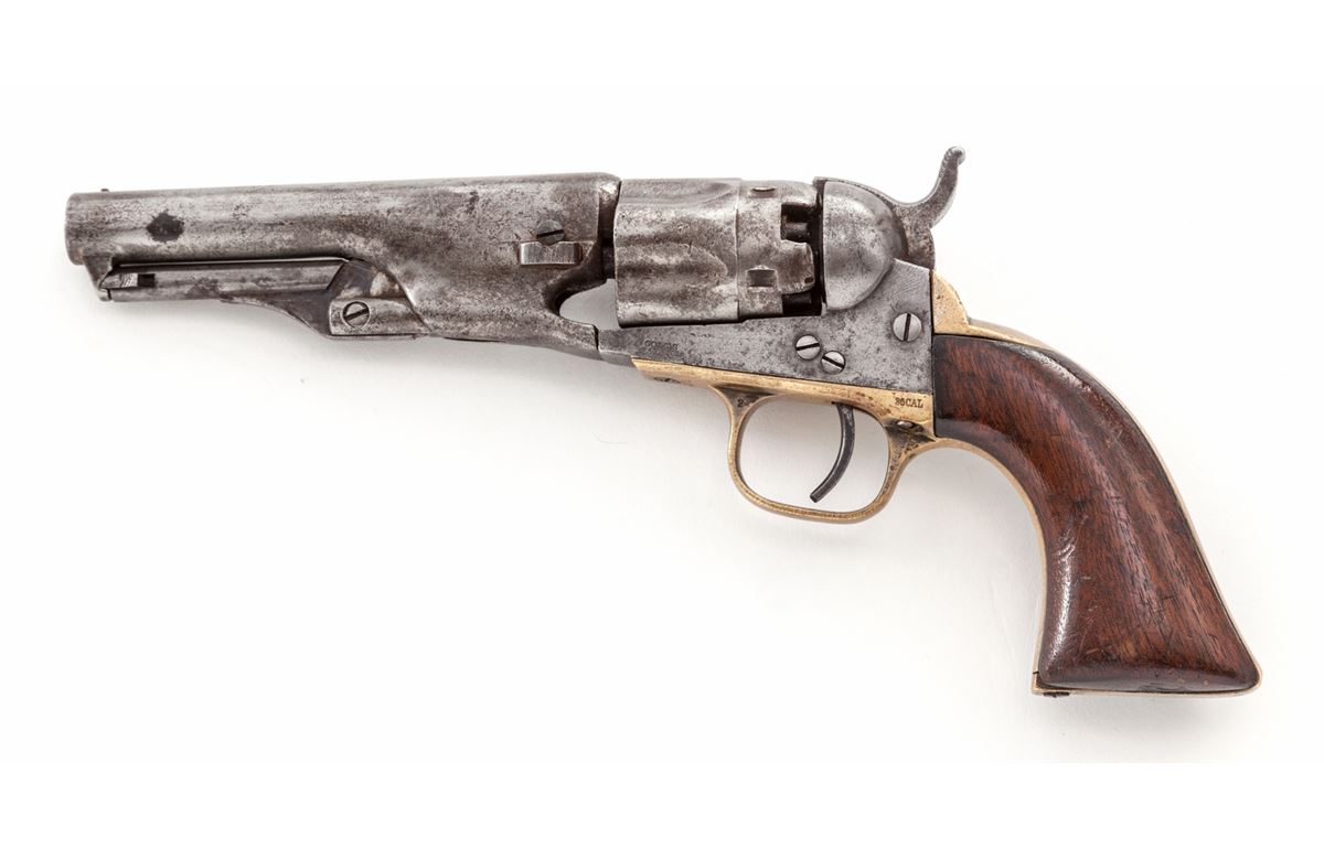Colt Model 1862 New Police Percussion Revolver, #16679, .36 cal., 4-1/2'' barrel, originally blue finish with case colored frame, one-piece walnut grips, with silver-plated backstrap and triggerguard. Mfg'd 1863. Condition is very good retaining trace amounts of finish in protected areas, as well as small amounts of silver. Grips show fractional shrinkage and rounding at both heel and toe. All visible matching numbers, except wedge is unmarked. Action is crisp, bore is fair. Est.: $600-$800. (Antique)