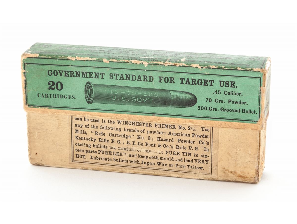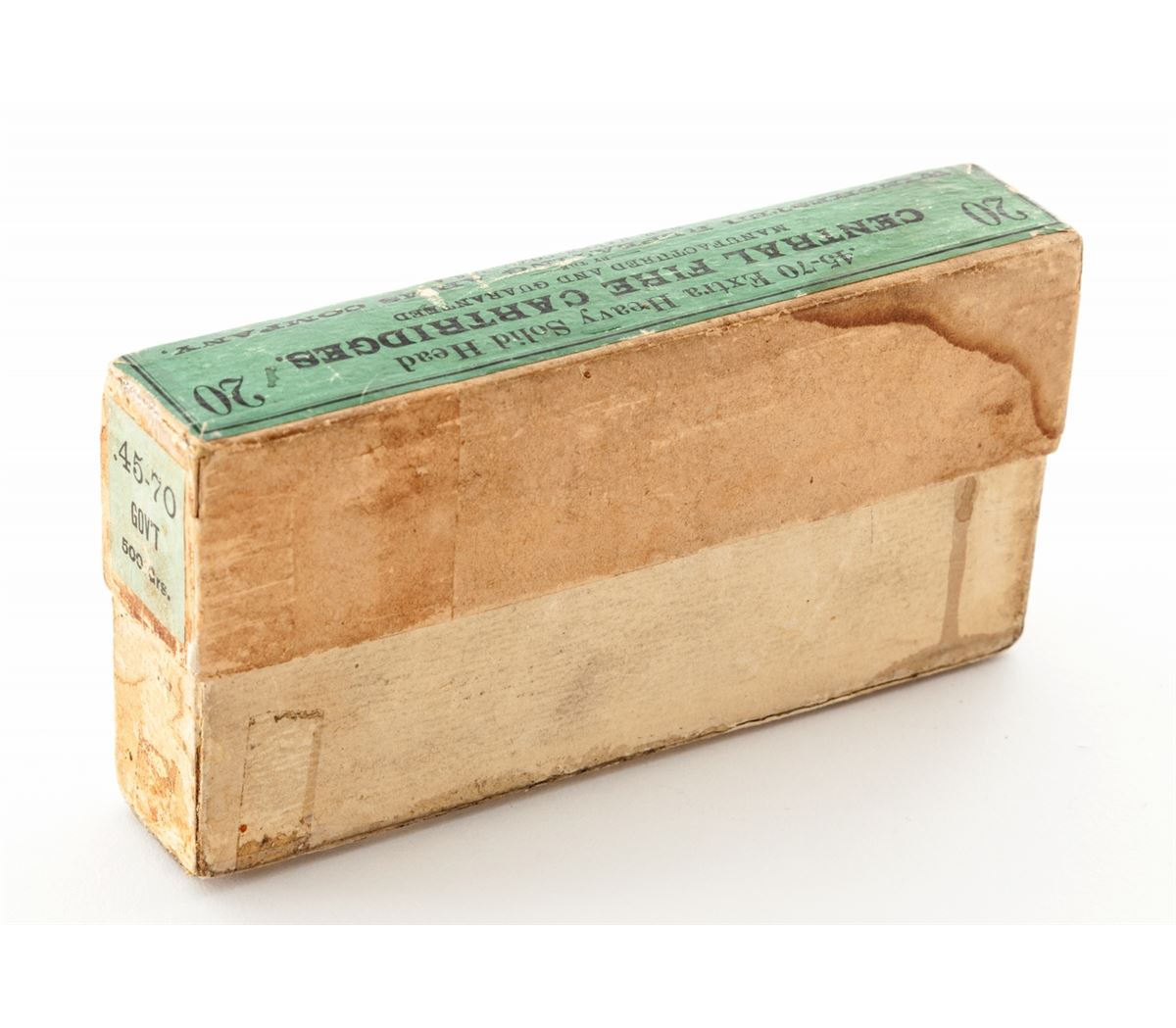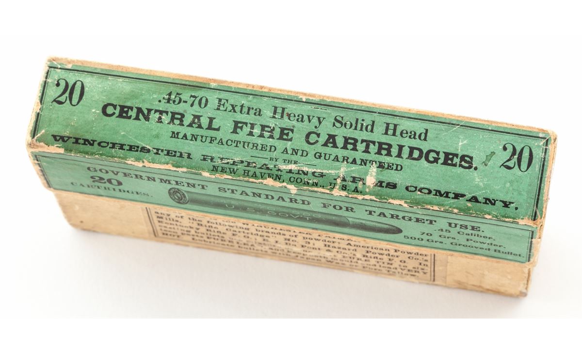 Mid-1890s Winchester Box of 20 .45-70-500 Cartridges, in full green labeled box. Top of box marked ''Central Fire Cartridges Manufactured and Guaranteed''. Condition is about fine with some losses along top edge and darkening to kraft surfaces. Split along bottom edge and some minor water discoloration. Est.: $350-$500.