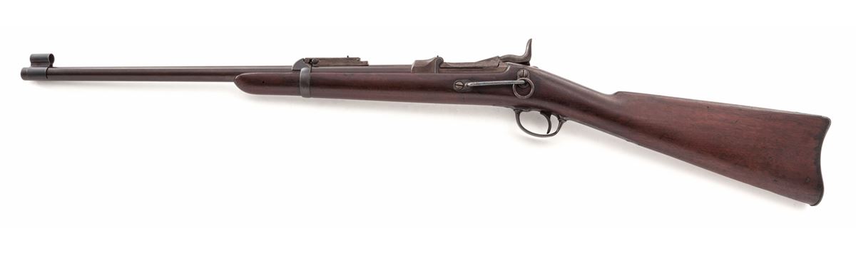 U.S. Springfield Model 1890 Trapdoor Carbine, #210008*, .45-70 cal., 22'' barrel, blue and case hardened finish, walnut stock, late type front sight cover, Buffington rear sight, 1873 dated breechblock, and special protector barrel band. Condition is fine showing light overall patination to metal surfaces. Unmarked stock with oil darkening near metal surfaces and very small losses to triggerguard tang. Action is good, bore is very good. Est.: $1,800-$2,400. (Antique)