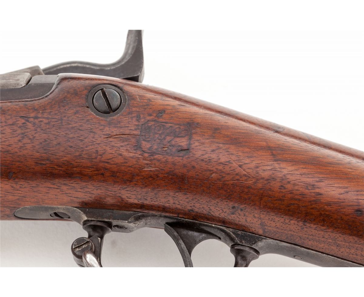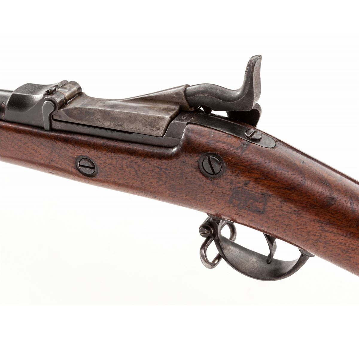 Model 1884 Trapdoor Rifle, by Springfield, #378156, .45-70 cal., 32-1/2'' blue barrel, case hardened breechblock dated 1884, with cartouched walnut stock. Condition is near excellent retaining approx. 85% toning arsenal blue. Case colored components have thinned to 70%. Stock with minor scraps and bruises. Cartouche remains mostly visible. Good action, bright bore. Est.: $800-$1,200. (Antique)