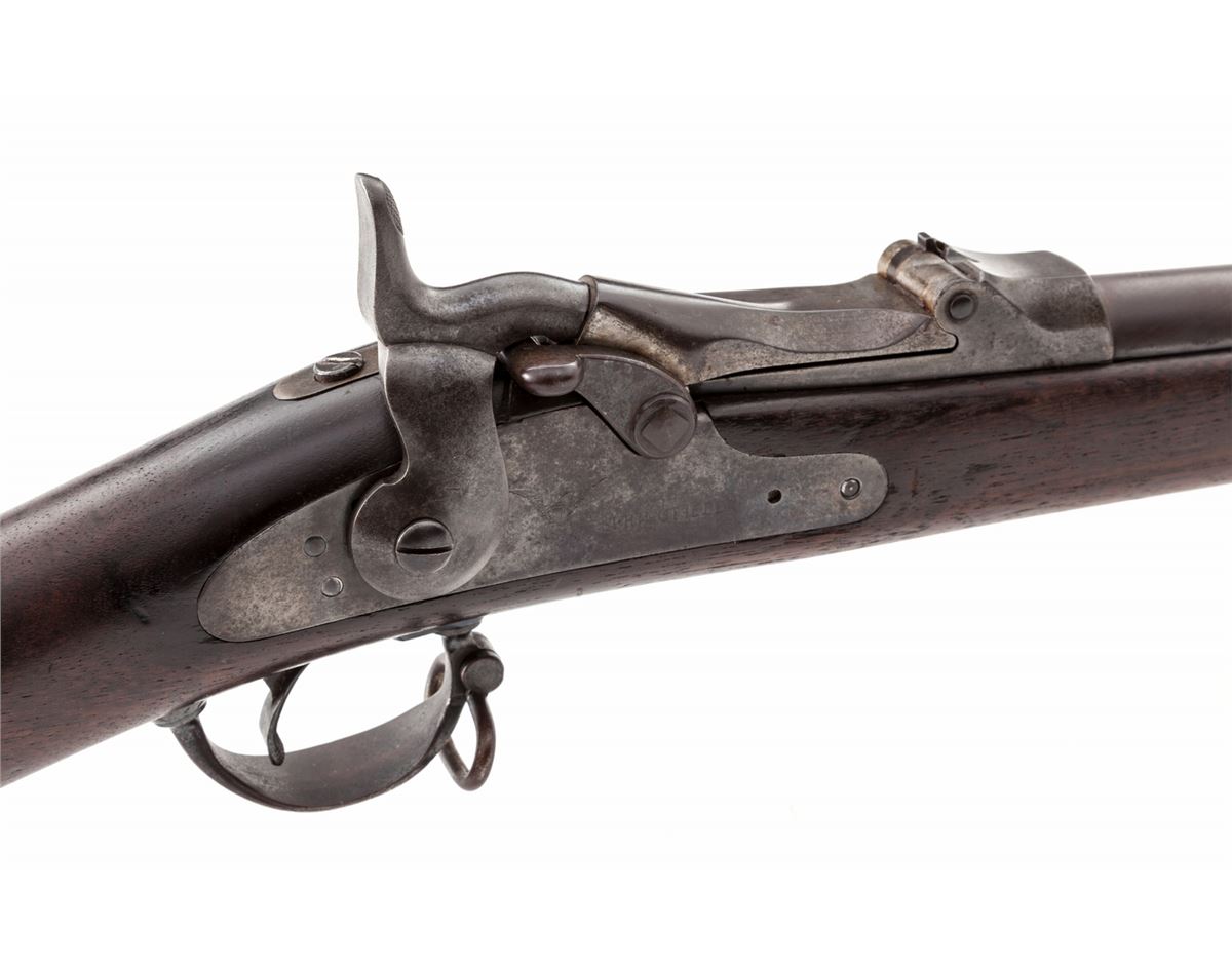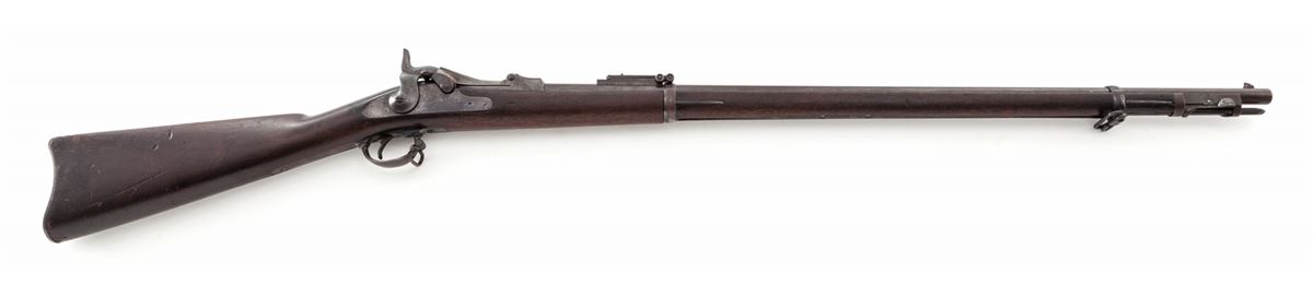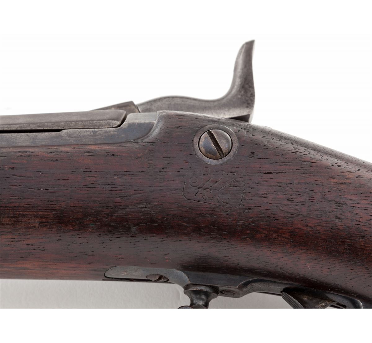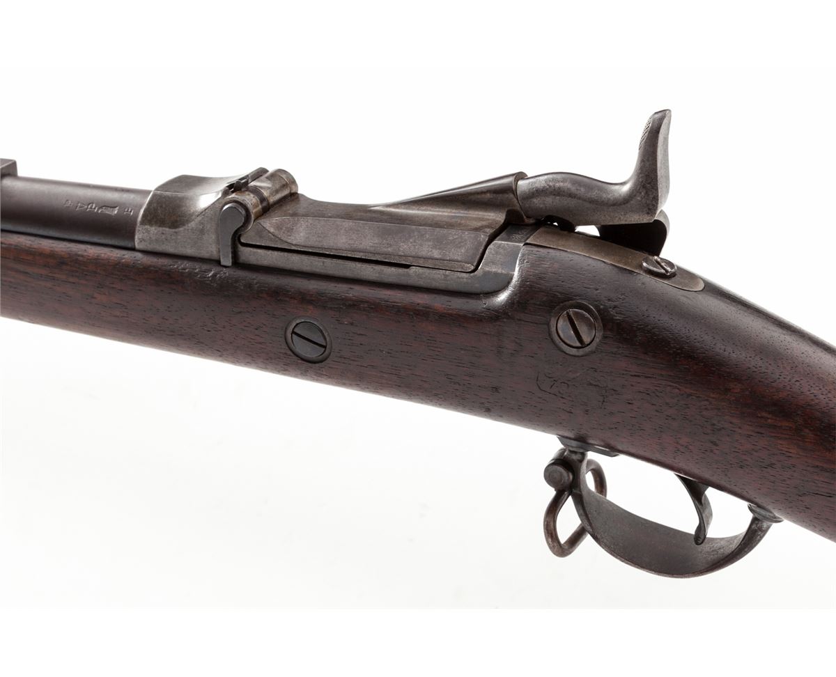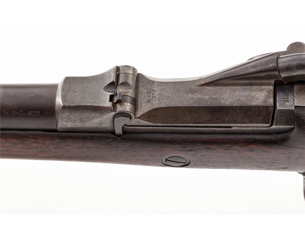 U.S. Model 1884 Trapdoor Rifle, with ramrod bayonet, by Springfield, #318634, .45-70 cal., 32-1/2'' barrel, blue and case hardened finish, with 1890 cartouched walnut stock. This particular rifle was one of only 1003 converted to this configuration. (See page 111-112, ''Trapdoor Springfields'', by Waite & Earnest.) Condition is very good to about fine with even brown toning to barrel and darkening to case hardened components. Stock with mostly visible cartouche, oil darkening and light scuffs and scratches; rack marks to top of comb. Good action and fine bore. Est.: $1,800-$2,400. (Antique)