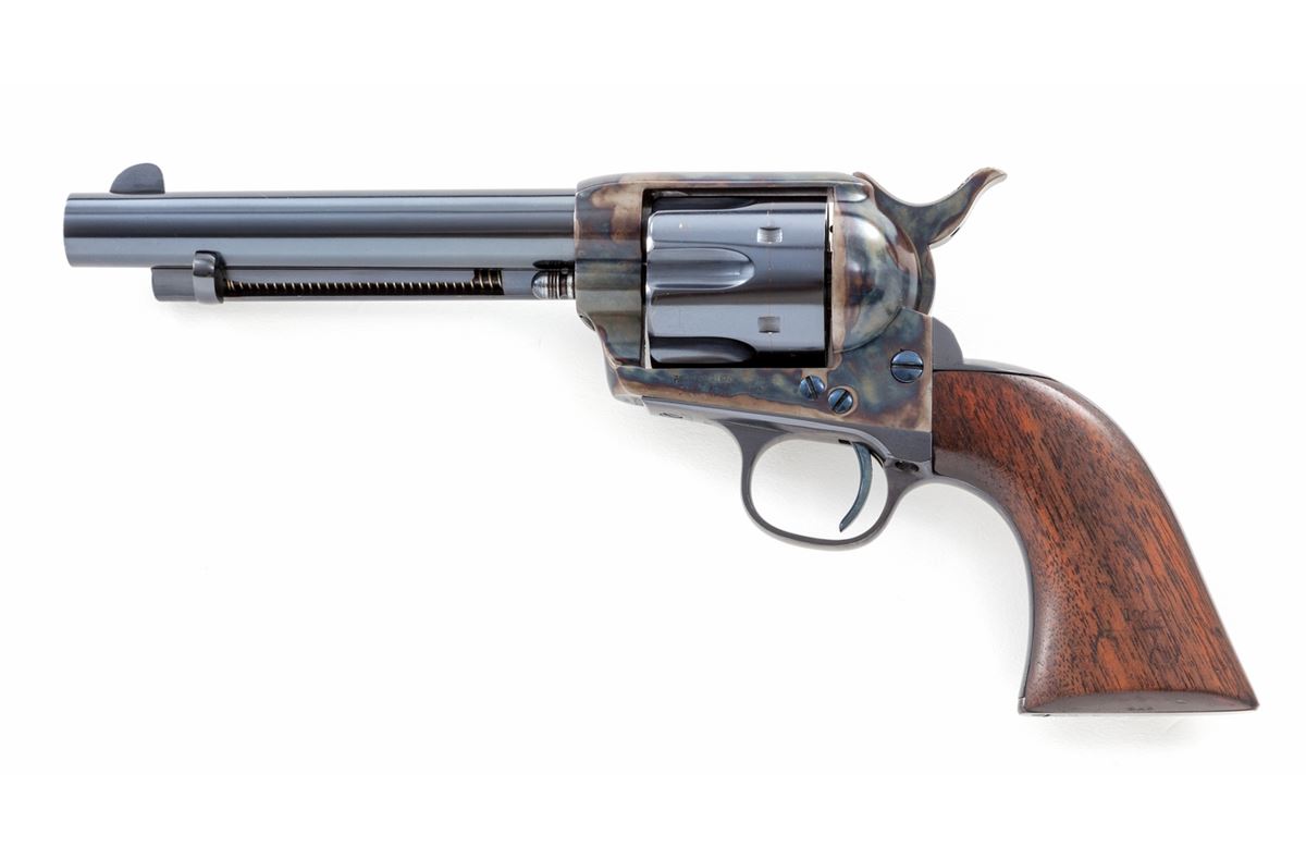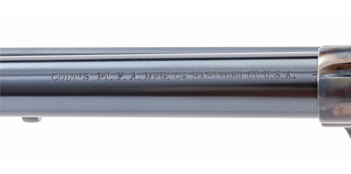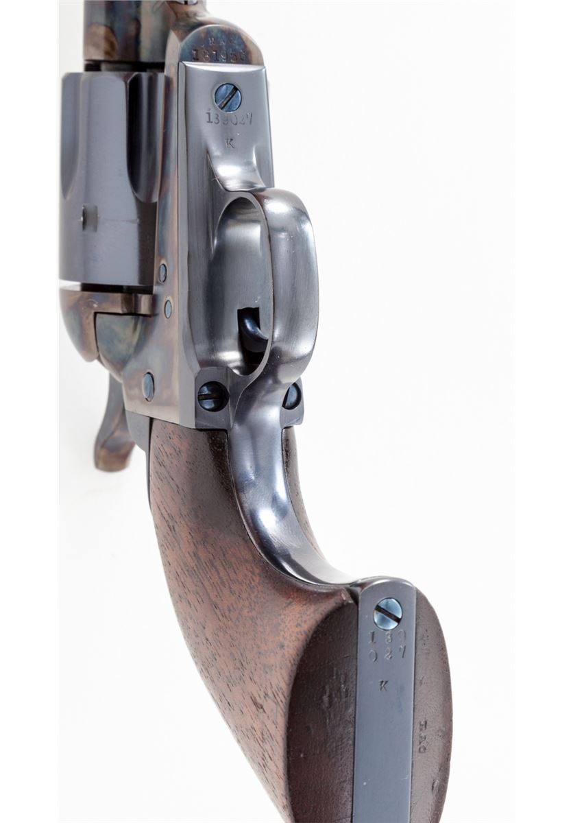 Colt Artillery Single Action Army Revolver, #131956 to frame, .45 Colt cal., 5-1/2'' barrel, blue finish, case hardened frame, one-piece lightly 1902 cartouched walnut grips. Backstrap and triggerguard numbered #139027; barrel with ''HN'' inspector marks; walnut grip with 1902 date, showing faint cartouche which is probably ''OCH'' and are ''RIC'' sub-inspected. Revolver was originally shipped in the early 1890s and overhauled in 1902 for 1903 shipment. Condition is excellent as professionally restored, retaining approx. 99% correct type blue and case hardening. Grips show trace amounts of original varnish. Action remains crisp, bore is fine. Est.: $4,000-$6,000. (C&R/PPT)