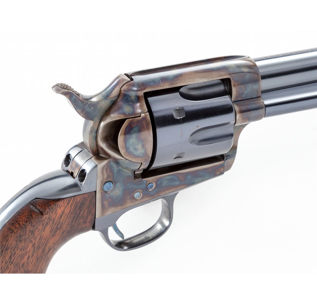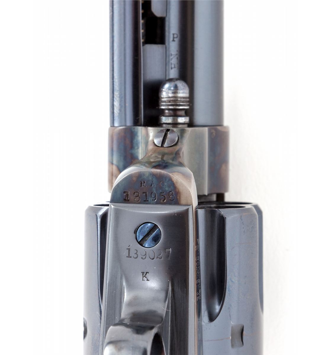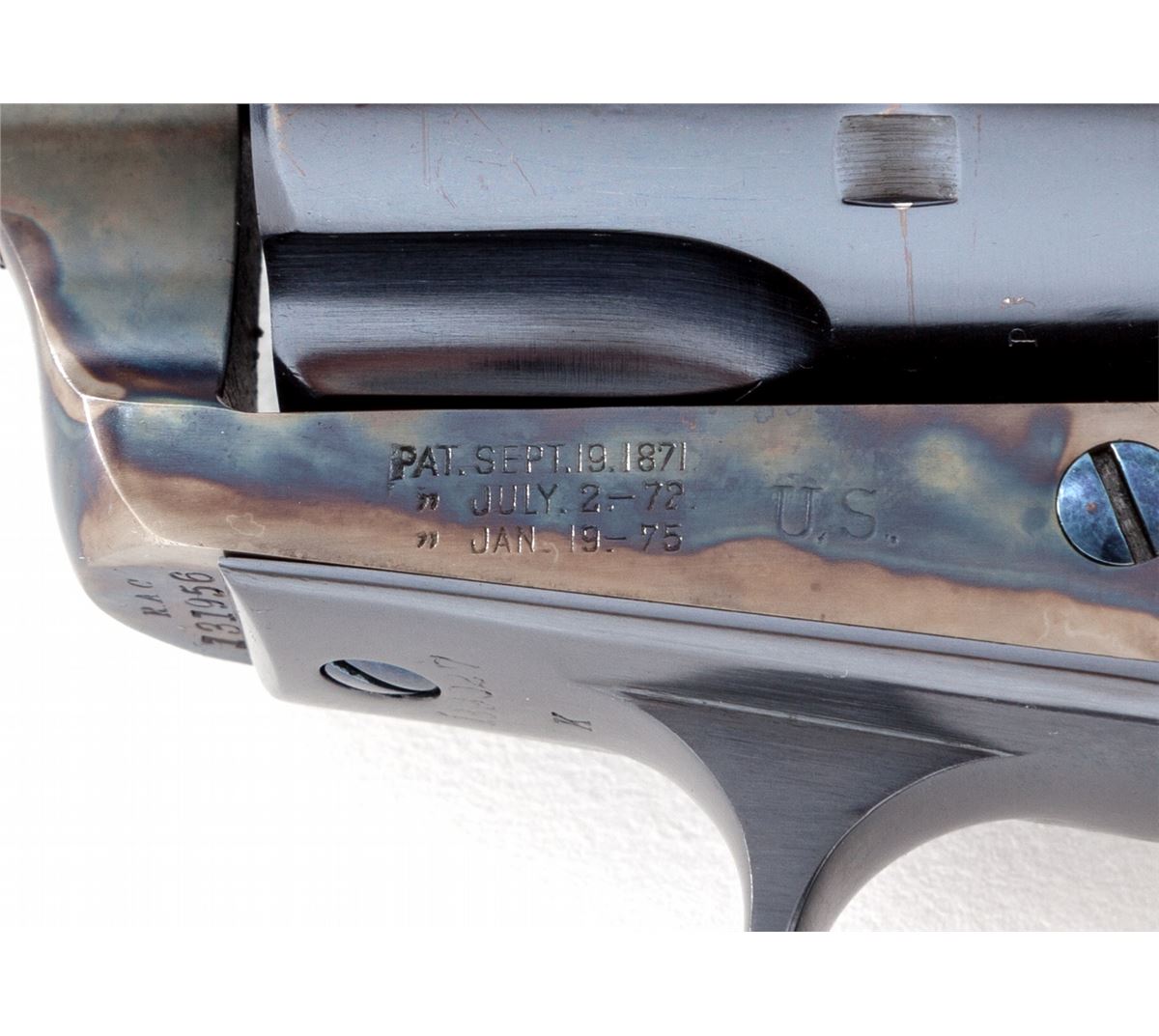 Colt Artillery Single Action Army Revolver, #131956 to frame, .45 Colt cal., 5-1/2'' barrel, blue finish, case hardened frame, one-piece lightly 1902 cartouched walnut grips. Backstrap and triggerguard numbered #139027; barrel with ''HN'' inspector marks; walnut grip with 1902 date, showing faint cartouche which is probably ''OCH'' and are ''RIC'' sub-inspected. Revolver was originally shipped in the early 1890s and overhauled in 1902 for 1903 shipment. Condition is excellent as professionally restored, retaining approx. 99% correct type blue and case hardening. Grips show trace amounts of original varnish. Action remains crisp, bore is fine. Est.: $4,000-$6,000. (C&R/PPT)