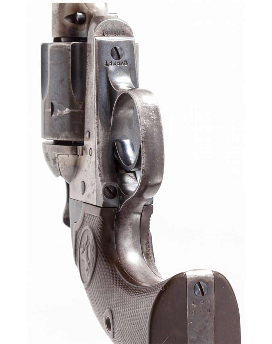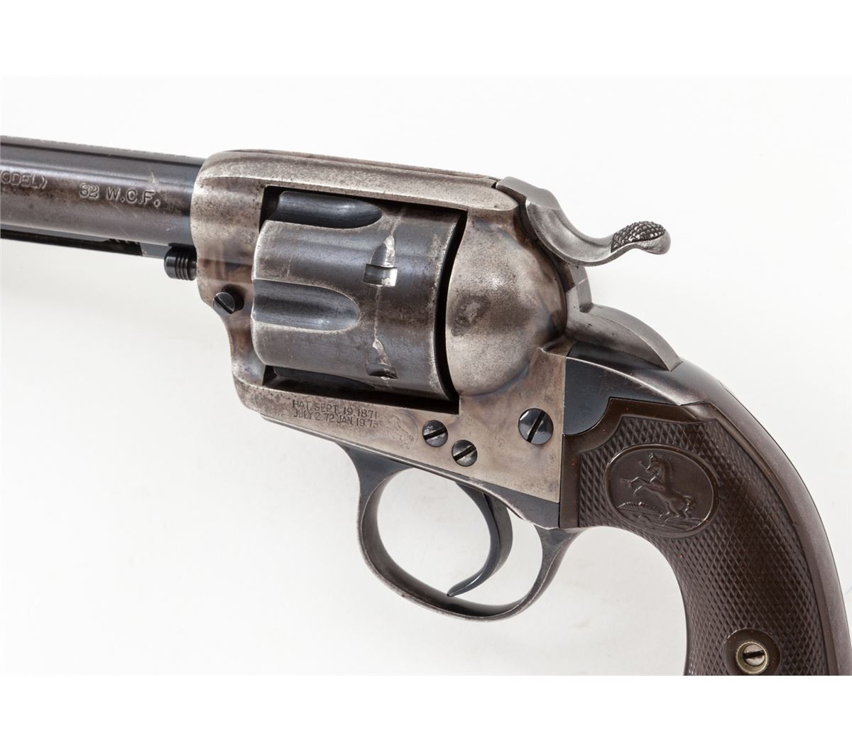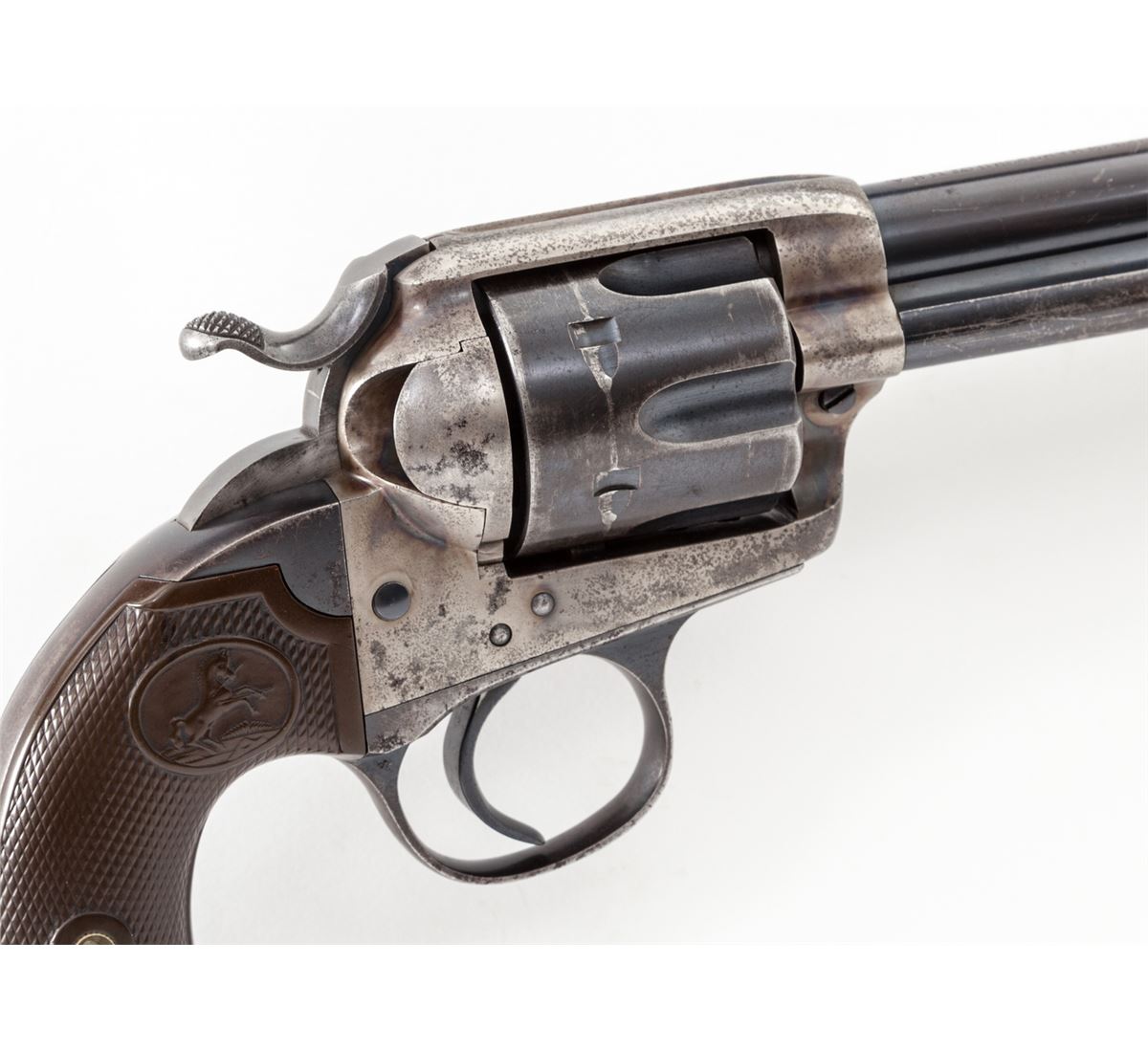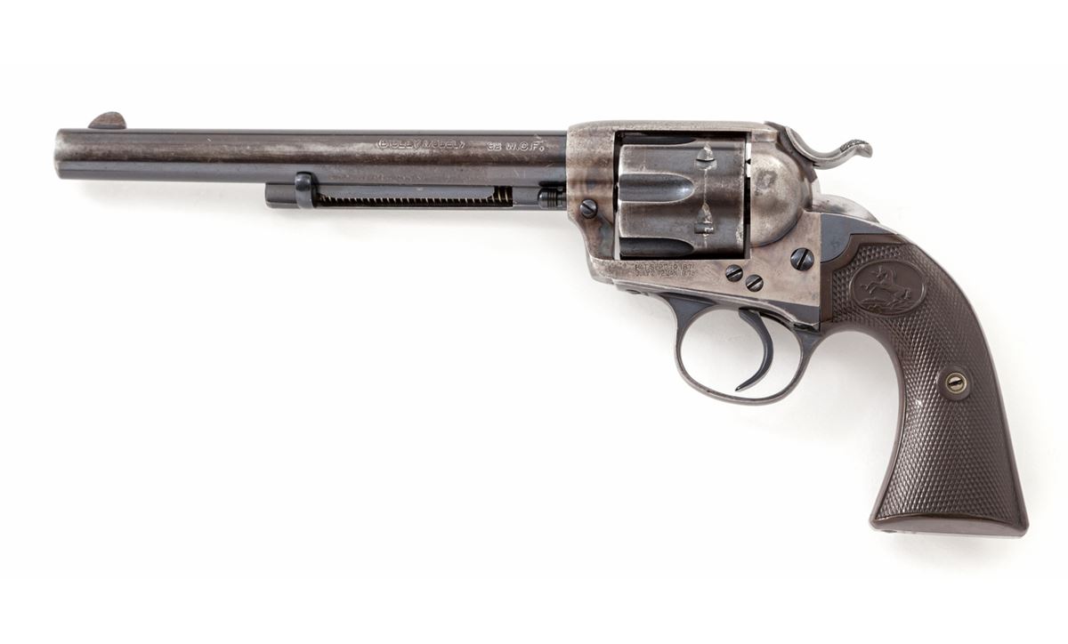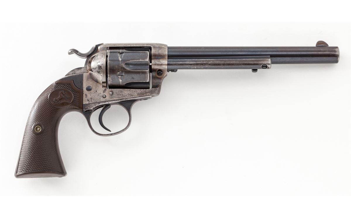 Colt Bisley Single Action Revolver, #192926, .32-20 cal., 7-1/2'' barrel, blue and case hardened finish, factory checkered hard rubber grips. Mfg'd 1900. Condition is very good retaining approx. 80% blue. Case colors have toned a mostly silvery color but still retains 60% muted colors. Grips with moderate flattening. Good action and bore. Est.: $1,200-$1,800. (C&R/PPT)