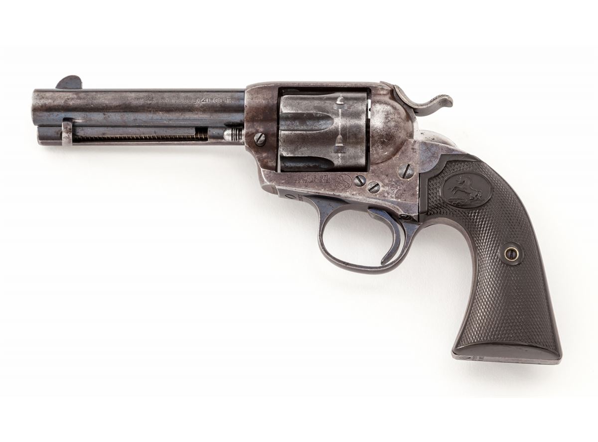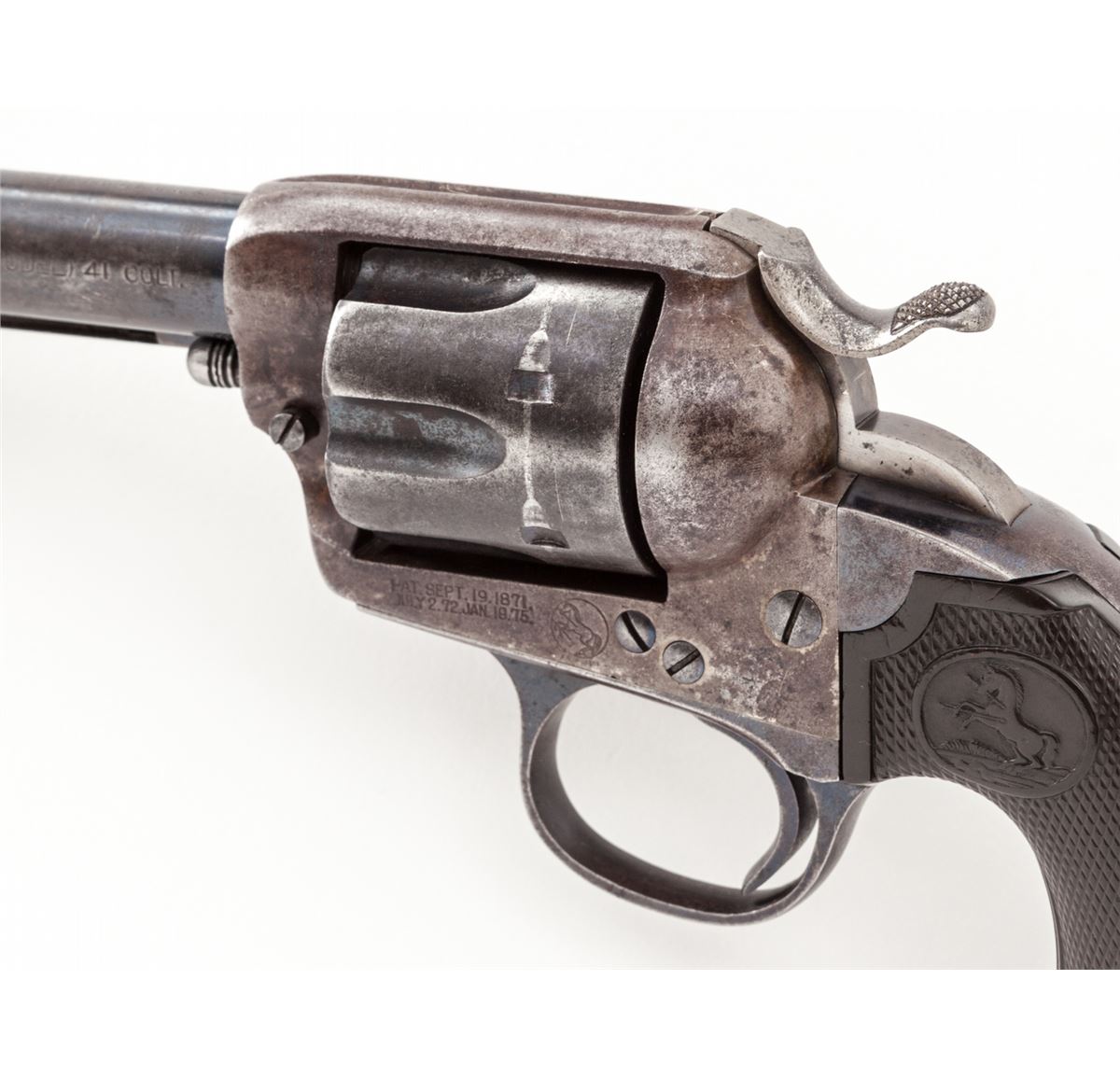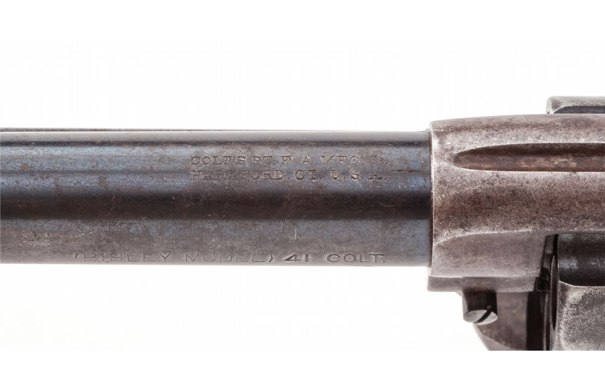 Colt Bisley Single Action Revolver, #229985, .41 cal., 4-3/4'' barrel, blue and case hardened finish, factory checkered hard rubber grips. Factory letter verifies all features, except grips not listed, shipped to Townley Metal & Hardware Co., Kansas City, MO, on Sept. 10, 1902, with four guns in shipment. Mfg'd 1902. Condition is very good retaining approx. 65% blue. Case colors have toned a grayish brown. Grips with moderate flattening. Good action and bore. Est.: $1,000-$1,500. (C&R/PPT)