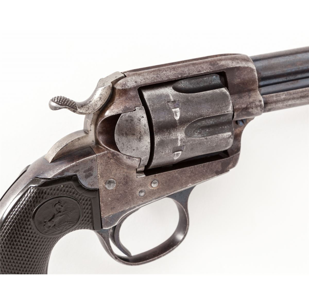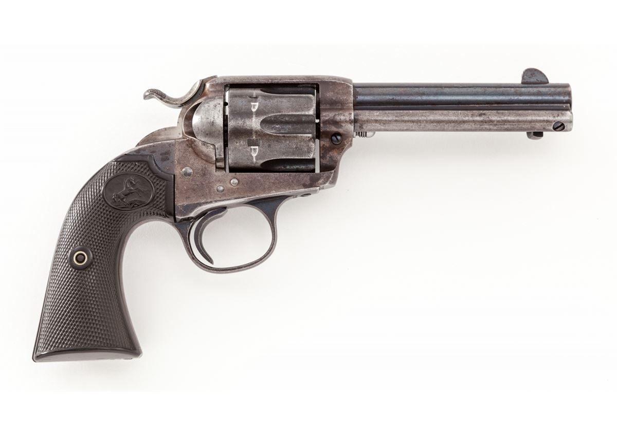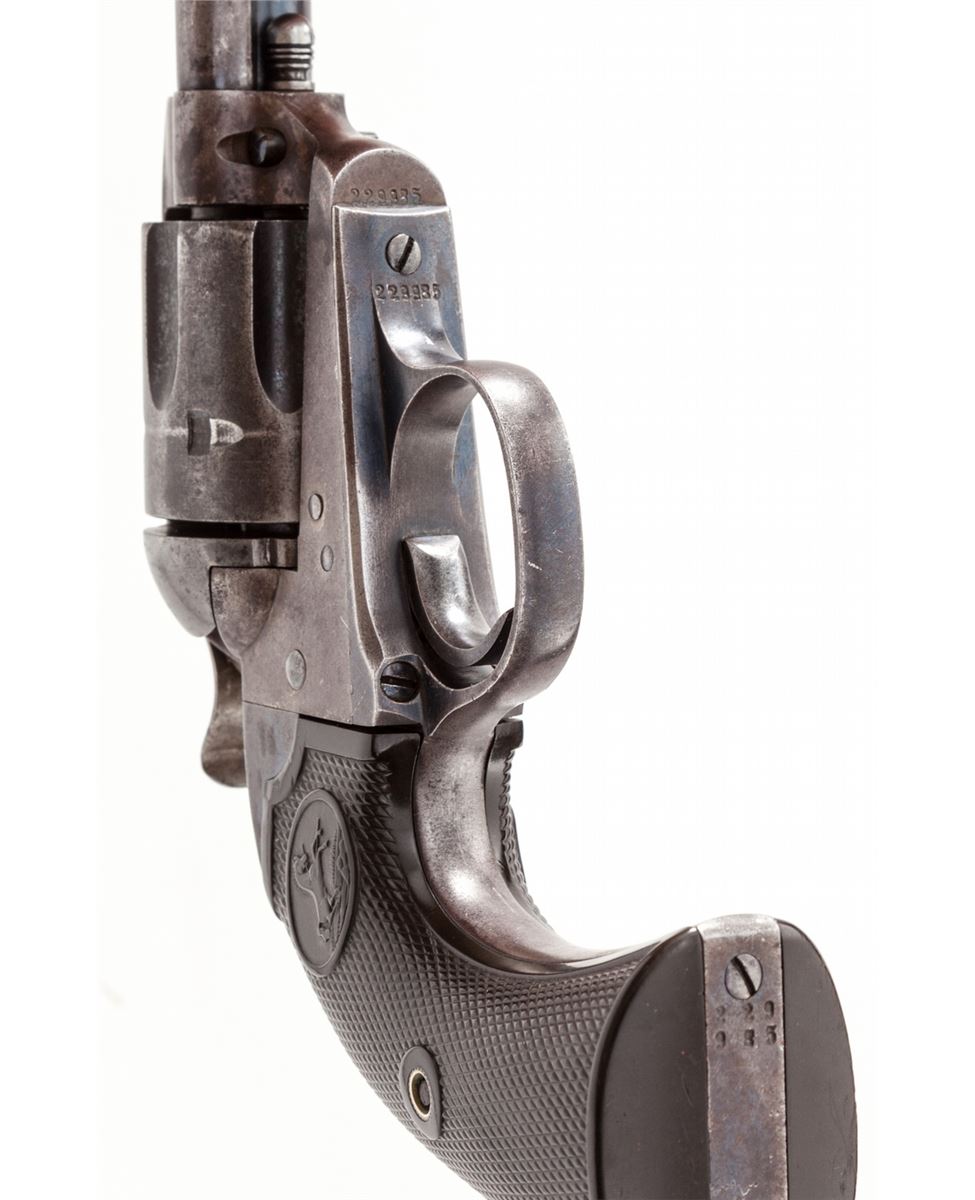 Colt Bisley Single Action Revolver, #229985, .41 cal., 4-3/4'' barrel, blue and case hardened finish, factory checkered hard rubber grips. Factory letter verifies all features, except grips not listed, shipped to Townley Metal & Hardware Co., Kansas City, MO, on Sept. 10, 1902, with four guns in shipment. Mfg'd 1902. Condition is very good retaining approx. 65% blue. Case colors have toned a grayish brown. Grips with moderate flattening. Good action and bore. Est.: $1,000-$1,500. (C&R/PPT)