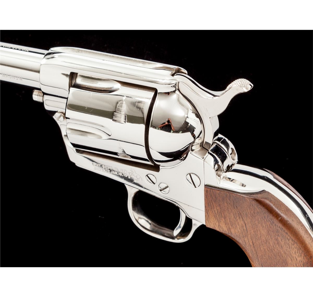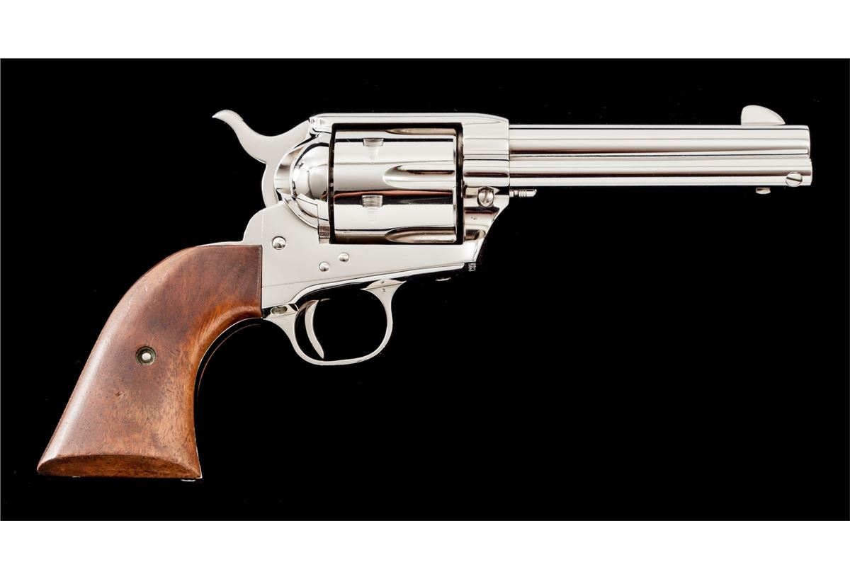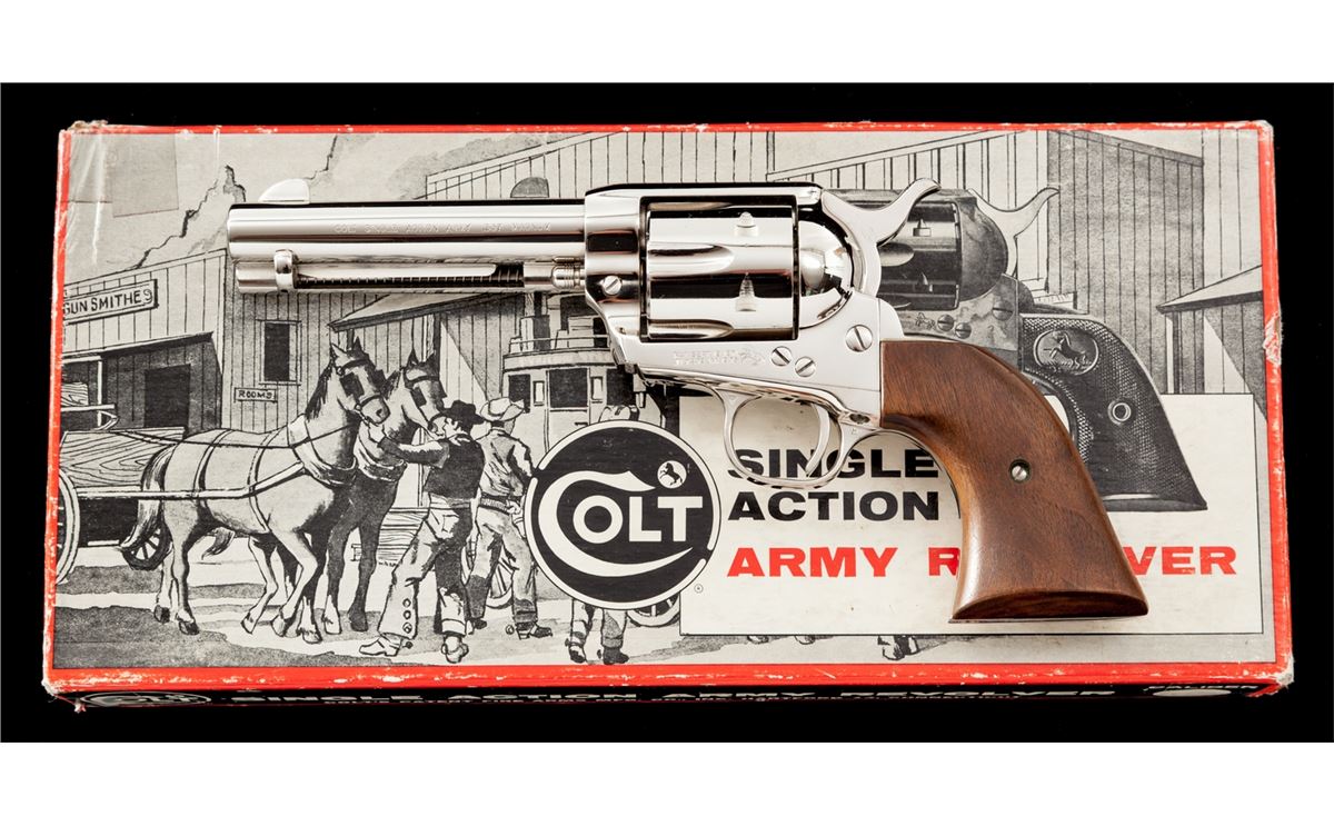 2nd Generation Colt Single Action Army Revolver, #44318SA, .357 mag. cal., 4-3/4'' barrel, nickel finish, two-piece smooth walnut grips, in original Colt stagecoach box. Mfg'd 1967. Condition is excellent showing very light micro-scratching to cylinder and backstrap. Grips with light impressions from handling. Action is crisp, bore is bright. Exterior of box with tape repairs to several corners and light thinning at high edges of lid. Est.: $1,800-$2,400. (C&R/PPT)